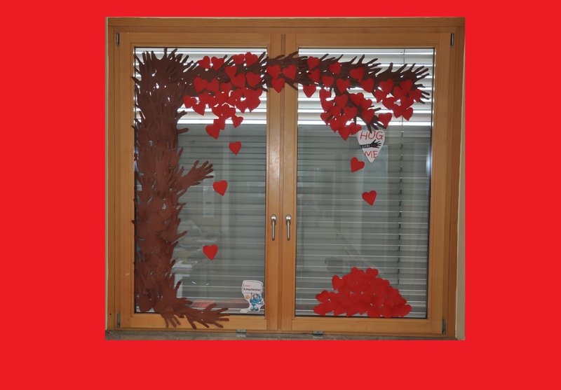 Die Klasse 4S arbeitete bereits im Vorfeld an der Verfassung von Liebesgedichten. Da kam das Buch "Hug me" gerade richtig, um bei diesem Thema zu bleiben und gleich an einem Leseschaufenster weiter zu basteln. Symbolisch für die Liebe wurde der Baum aus Händen gewählt - ineinander verschlungen, Hände reichend, verbunden, aber auch abweisend - sowie die Blätter aus Herzen - wundervoll, prächtig, leicht, manchmal auch vergänglich. Zwei Seiten der Liebe in einem harmonischen Bild integriert.