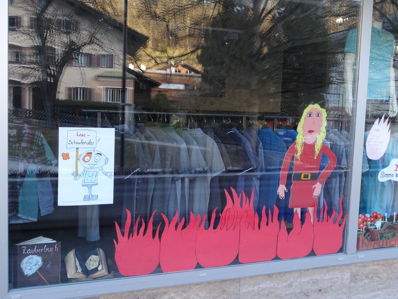 Wir haben das Buch "Alice - Stimme aus dem Feuer" als Klassenlektüre gewählt. Nachdem wir das Buch gelesen haben und verschiedene Arbeitsaufträge bearbeitet wurden, machten sich die Schüler Gedanken, wie wir das Leseschaufenster gestalten könnten. Fleißig wurde im Unterricht und zu Hause gebastelt und gezeichnet.