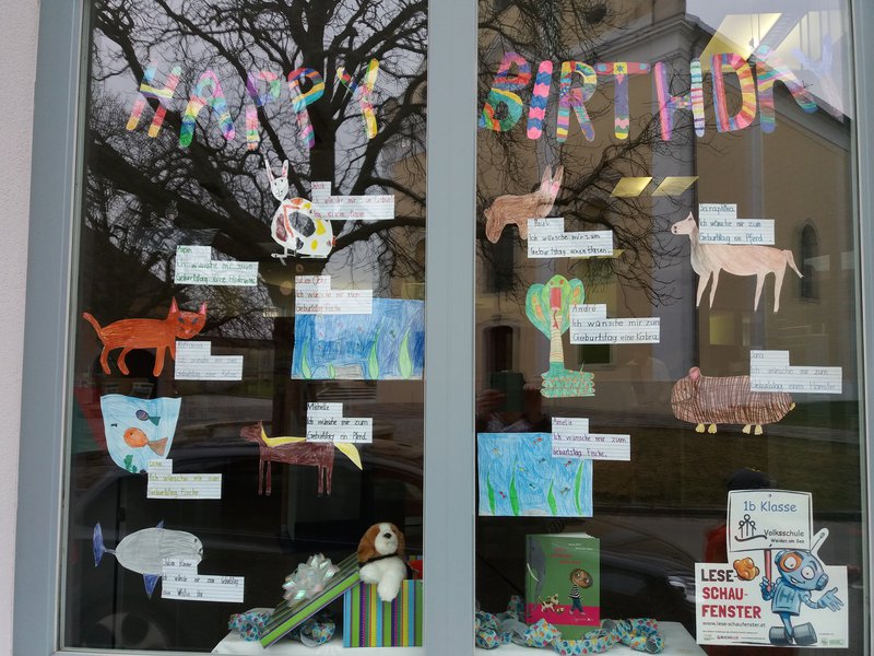 Nachdem wir gemeinsam das unterhaltsame Buch "Nele wünscht sich was" gelesen haben, überlegten sich die Kinder, welches Tier sie sich zum Geburtstag wünschen würden. Alle zeichneten und schrieben ihren Geburtstagswunsch auf. Mit diesen Zeichnungen gestalteten wir unser "tierisches" Leseschaufenster, in dem man auch sehr außergewöhnliche Haustiere entdecken kann. Natürlich durfte Neles Geburtstagsgeschenk, ein Welpe, im Schaufenster nicht fehlen.- Projektleitung: