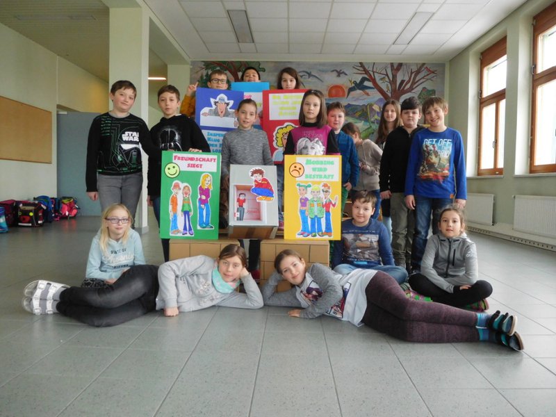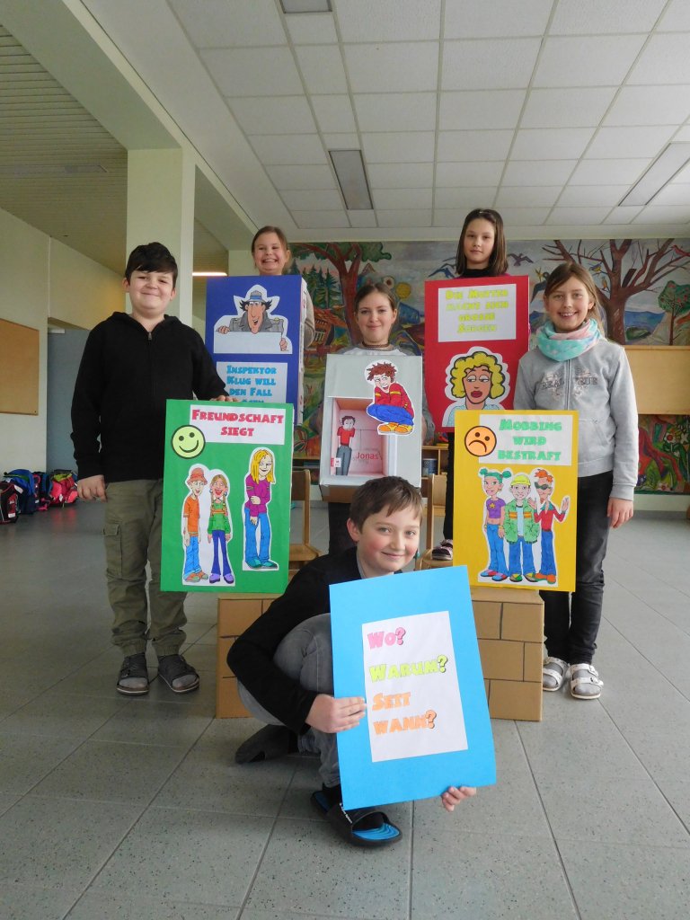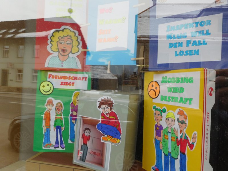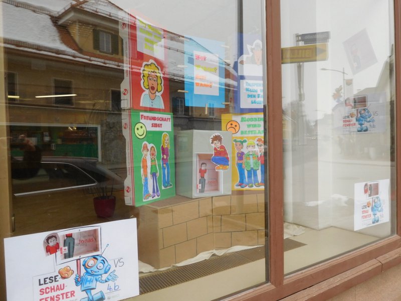 Das Buch zum Thema Mobbing war für die Schülerinnen der 4. Klasse sehr anspruchsvoll. In einfühlsamen Gesprächen wurden mit den Kindern die Gefühle und Geschehnisse, die im Buch auftauchen, bearbeitet. Wie wichtig doch die Freundschaft ist, sollte im Leseschaufenster deutlich werden.