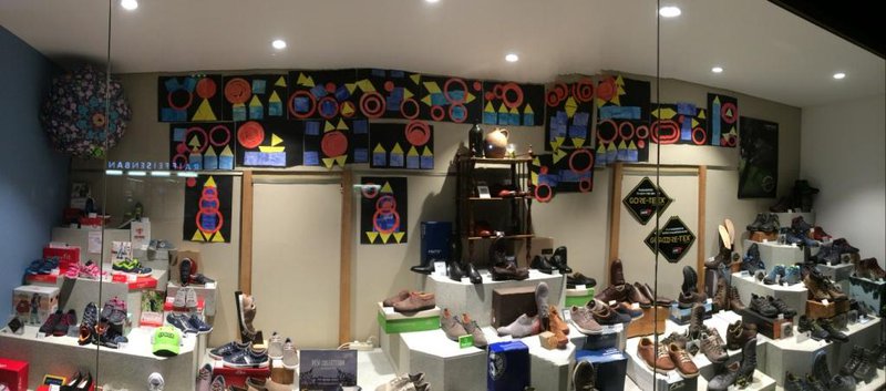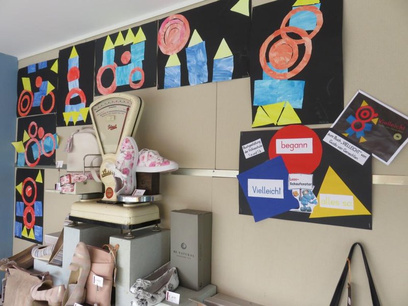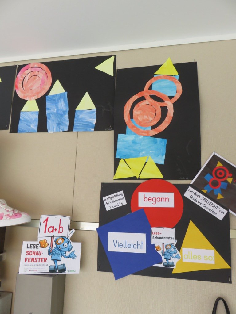 "VIELLEICHT begann alles so..." ... weiße Blätter ... blaue, gelbe, rote Wasserfarbe ... ein blaues Blatt, ein gelbes Blatt, ein rotes Blatt ... vier blaue Vierecke, vier gelbe Dreiecke, vier rote Kreise ... Lokomotive, Auto, Eule, Sonne und Meer, Kirche, Häuser, Motorrad, Windmühle, Rakete, ... Sicher begannen so die Kunstwerke der Erstklässler aus der VS Fehring, die jetzt im Schuhhaus Kalcher am Hauptplatz zu bewundern sind. Das Buch "Vielleicht" von Guido van Genechten diente uns als Inspiration und weil es so lustig war, haben die Kinder gleich einen Leseplan dazu bearbeitet.- Projektleitung: