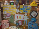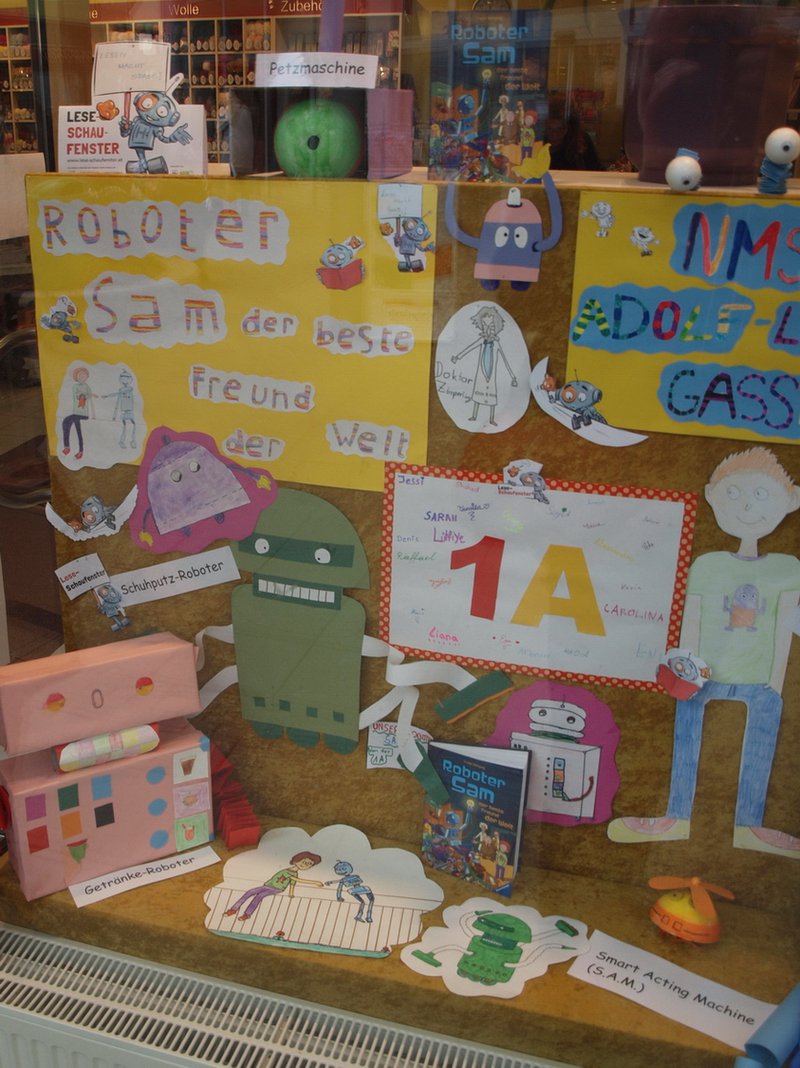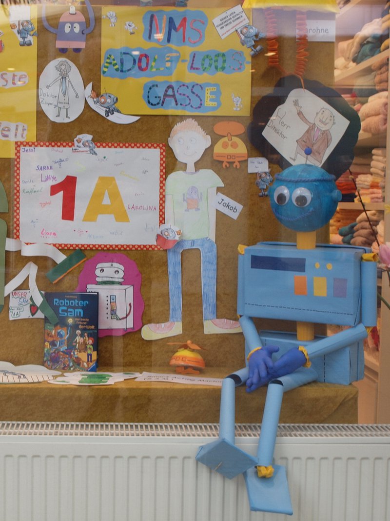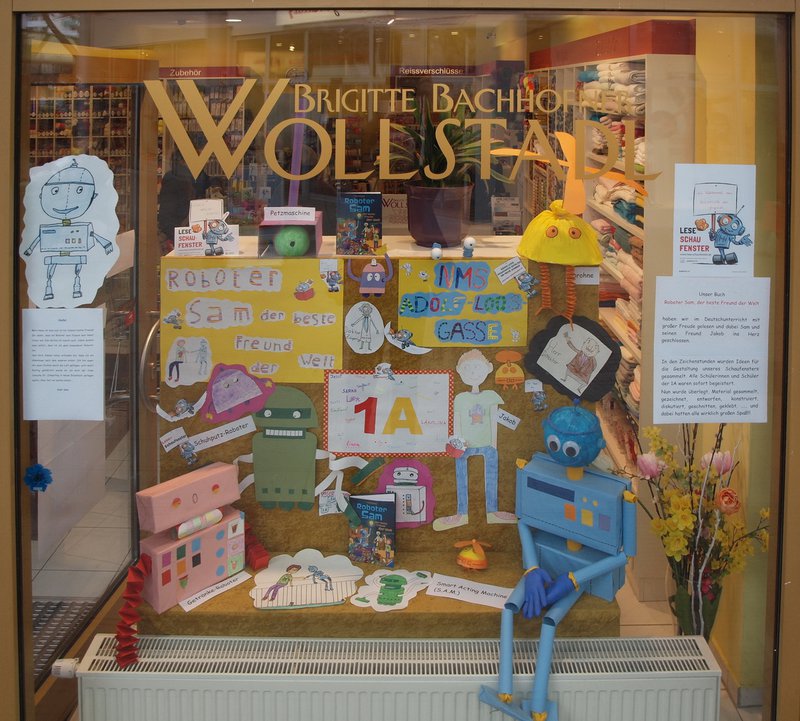 Das Buch wurde in den Deutschstunden mit großer Freude gelesen und besprochen. In den Zeichenstunden haben die Kinder Ideen und Vorschläge zur Gestaltung des Schaufensters gesammelt. Mit Schuhschachteln, Naturpapier, Seidenpapier, Küchenrollen, Styroporkugeln, Spagat, Wolle, Wasserfarben, usw. bauten die Schülerinnen und Schüler in Kleingruppen verschiedene Roboter (Sam, Getränkeroboter, Drohnen) und fertigten Plakate und Zeichnungen an. Seit 24. März kann man unser Schaufenster im "Wollstadl" bewundern. Im Schulhaus gestalteten wir eine Schautafel mit Fotos und Zeichnungen, um auf unser Projekt aufmerksam zu machen.- Projektleitung: