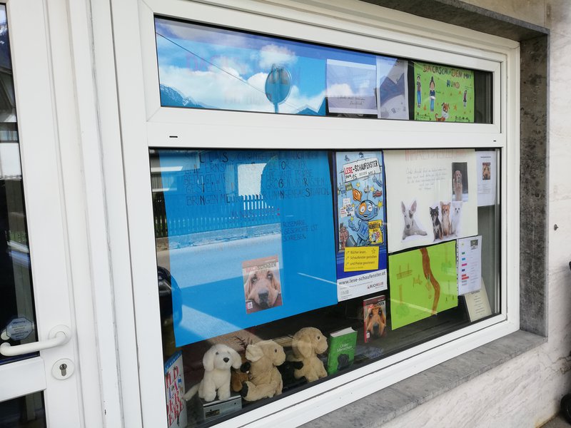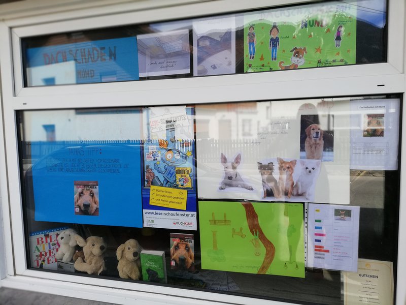 Die Tierambulanz in Schwaz "erlitt" einen "Dachschaden", da vom Obergeschoß Wasser eindrang. Da bot es sich an, das Buch "Dachschaden mit Hund" dort zu präsentieren. Die Kinder der 1 S Klasse gestalteten Plakate, beschäftigten sich mit Steckbriefen über Hunderassen, zeichneten Situationen aus dem Buch nach, machten sich Gedanken über die Charaktereigenschaften der Hauptpersonen und sammelten Stofftiere, um das Schaufenster gut in Szene setzen zu können.- Projektleitung: