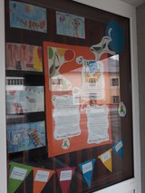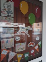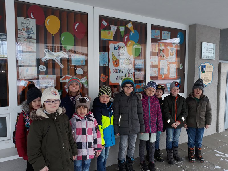 Die erste Klasse ganz stolz vor dem Schaufenster