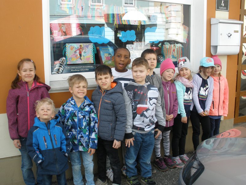 Der fliegende Teppich aus dem wunderbaren Geschichtenbuch von Erwin Moser begeisterte die Kinder der 1b. So entstanden im Zeichenunterricht bunte Teppiche, die mit Fotos der Kinder beklebt wurden. Eine Wäscheleine mit den Teppichen schmückt im Monat April das Schaufenster der Pizzeria.- Projektleitung: