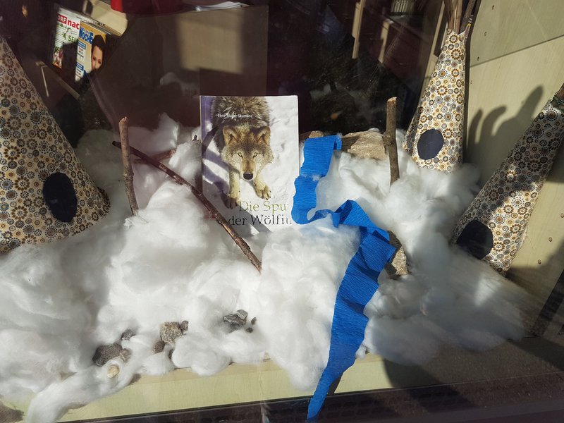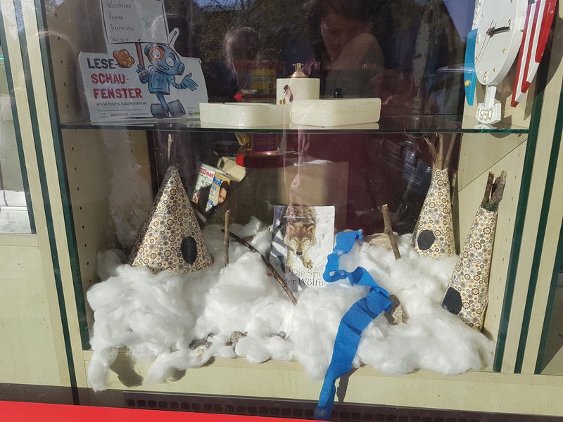 Wir haben das Buch "Die Spur der Wölfin" gelesen (Leider haben wir ein Buch aus einer falschen Liste ausgewählt - Wir hoffen, dass wir trotzdem am Bewerb teilnehmen können) Mittels einer Buchvorstellung haben wir das Buch dem Rest unserer Klasse in Deutsch vorgestellt. In unserem Schaufenster, das wir in Werken und BE gestalteten, möchten wir die Winterlandschaft aus dem Buch darstellen. Mit Steinen haben wir die Spuren der Wölfin im Schnee (Watte) gelegt. Der Fluss aus Krepppapier führt durch die Winterlandschaft, mit der wir das Gefühl der Kälter vermitteln wollen. Die Tipis haben wir aus Ästen und Stoff gebaut.- Projektleitung: