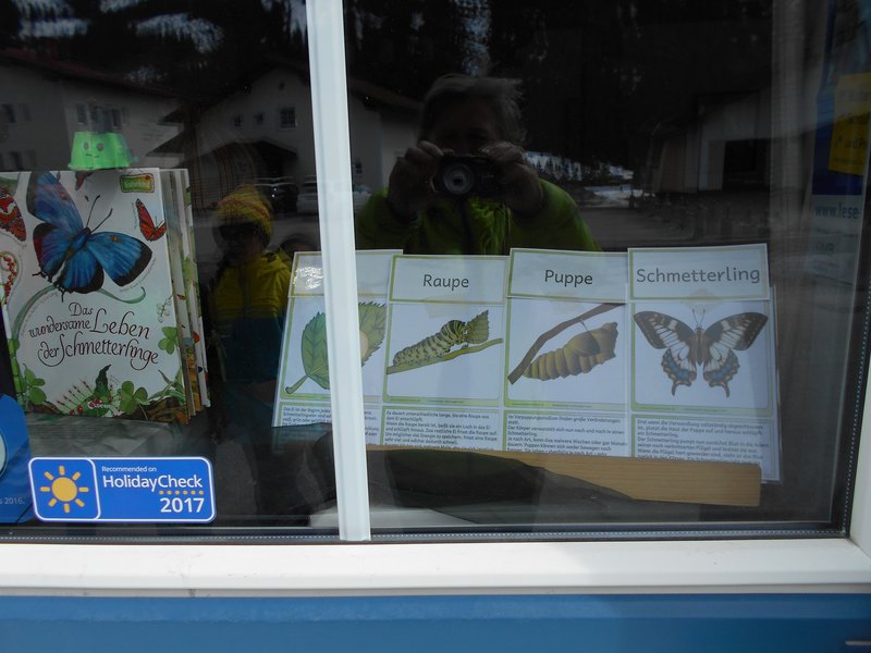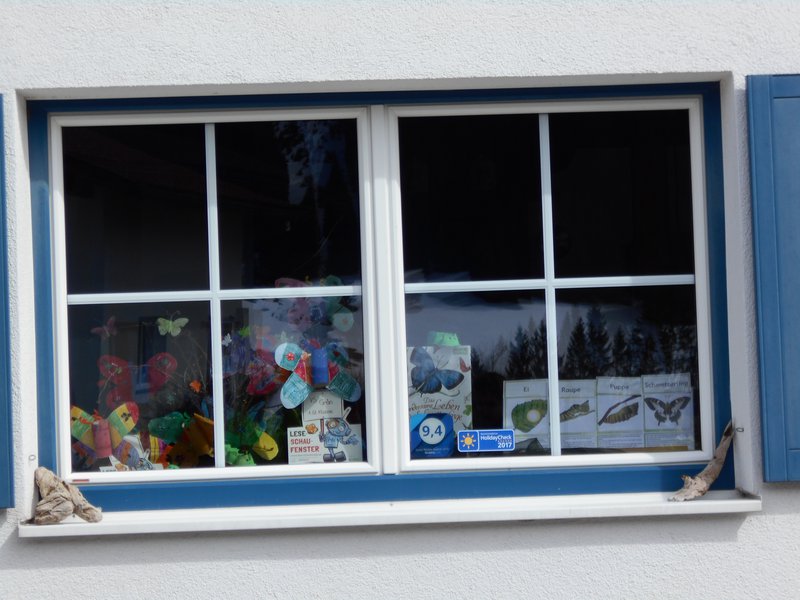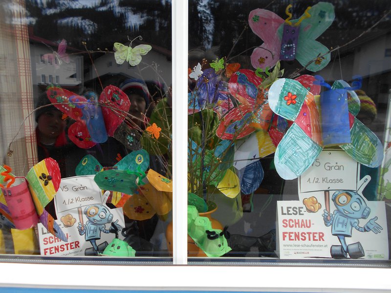 Die Schüler der 1. /2. Schulstufe der VS Grän wählten das Sachbuch „Das wundersame Leben der Schmetterlinge“. Die Kinder waren fasziniert von der Vielfalt und wie facettenreich Schmetterlinge sind. Es beinhaltet viele Informationen über das Leben. Auch die Entstehung wird ganz genau beschrieben und mit anschaulichen Bildern erklärt. Wir haben ein Schmetterlingsbüchlein bearbeitet. Anschließend bastelten die Kinder Schmetterlinge und Raupen, die liebevoll gestaltet, bemalt und verziert wurden. Im Schaufenster steht eine Vase mit Kirschzweigen, an denen die Schmetterlinge und Raupen befestigt wurden. Die Entstehung wird mit Bildern und kurzen Texten nochmals beschrieben.- Projektleitung: