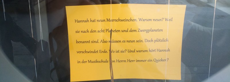 Gemeinsam hat die 3. Klasse das Buch gelesen. Dazu haben wir Meerschweinchen aus Wolle gebastelt. Jedes der neun Meerschweinchen hat den Namen eines Planeten (ein Zwergplanet ist auch dabei). Zusätzlich haben wir die Musikschule von Herrn Herr in der Schule gemeinsam bemalt, beklebt und beschrieben.