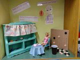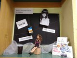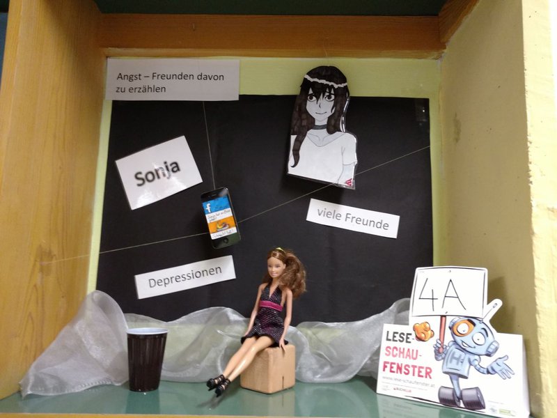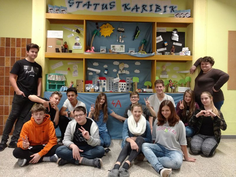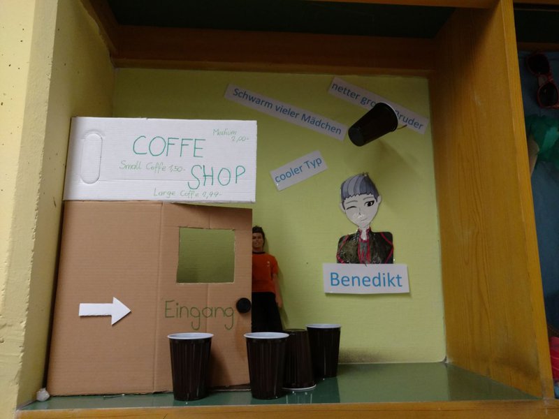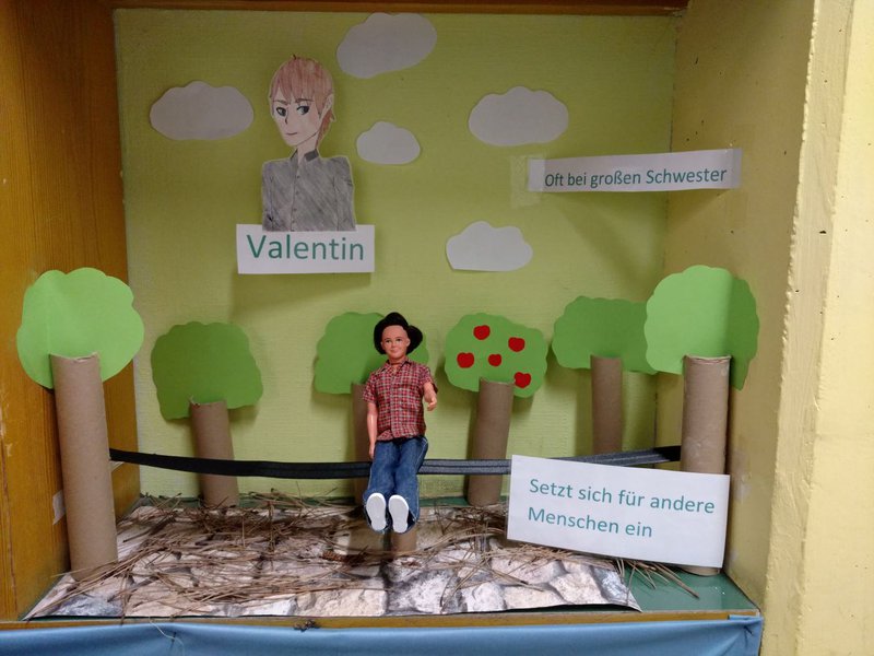 Unser Leseschaufenster ist unterteilt in 6 Einzelbilder. Fünf davon sind den Hauptcharakteren gewidmet. Das sechste Fenster steht für Aruba, die Karibikinsel, die einen wichtigen Teil des Buchinhaltes einnimmt. Nachdem das Buch gelesen und intensiv aufbereitet wurde, sammelten wir Ideen zur Gestaltung des Schaufensters. Anschließend wurden Gegenstände und Objekte gesammelt und das Gesamtbild durch selbstgebastelte Gegenstände vervollständigt. Schlagwörter geben zusätzliche Informationen.
