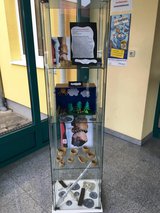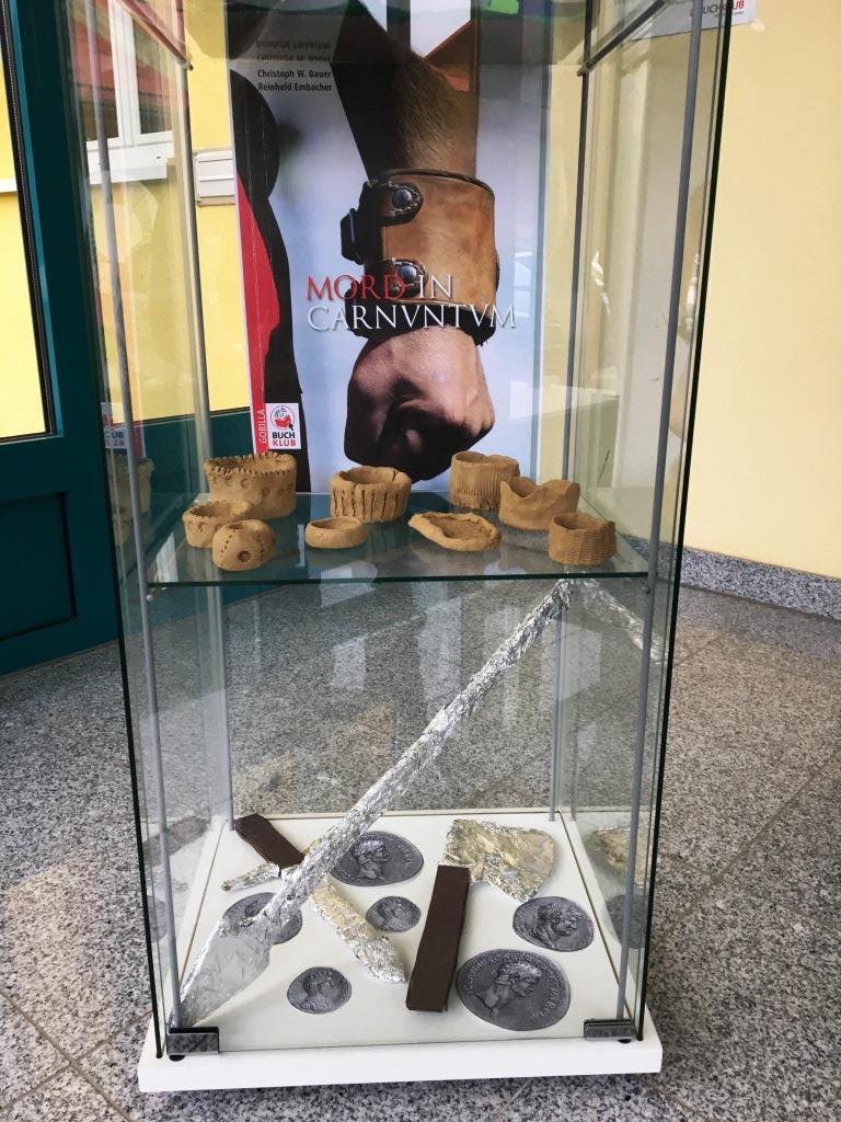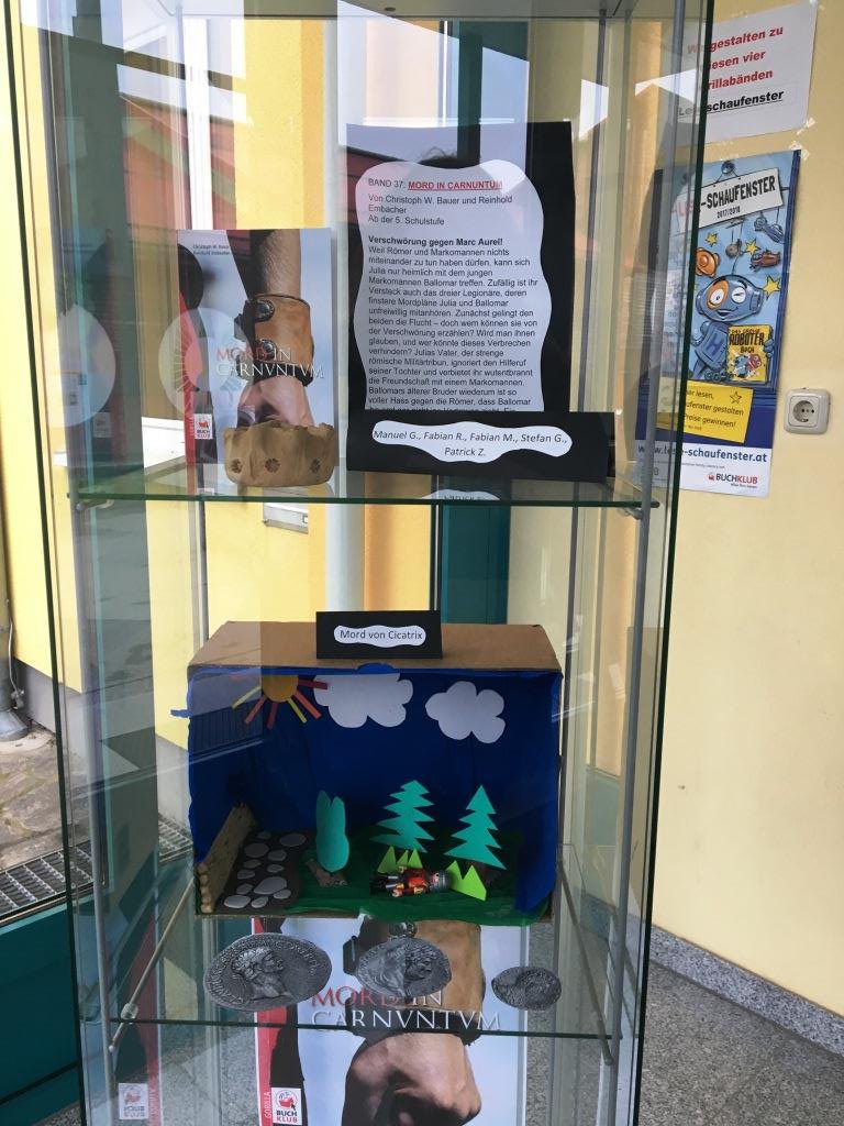 Die Schüler gestalteten einen Schaukasten zu ihrem gewählten Buch und beschreiben das Buch wie folgt: Wir haben dieses Buch gewählt, weil die Leseprobe, die wir bekommen hatten, sehr spannend war. Das Buch handelt von der Römerin Julia und Markomanne Ballomar. Im BE-Unterricht besprachen wir, welche Materialien wir für unser Leseschaufenster benötigen würden. Im ersten Teil unseres Schaufensters sieht man die Ton-Gefäße von Ballomars Mutter. Im zweiten Teil erkennt man die Darstellung des geschehenen Mordes, der hinter dem Busch liegt. Ganz unten haben wir die Waffen, mit denen die Römer früher gekämpft haben, visualisiert. Dieses Buch war für uns sehr spannend zu lesen, aus diesem Grund war es für uns sehr einfach und lustig, das Leseschaufenster zu erarbeiten.- Projektleitung: