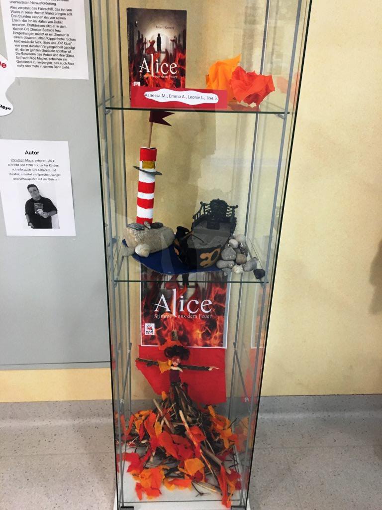 Wir wählten das Buch, da uns der Einband sehr interessant erschien und uns auch die kurze Inhaltsangabe sehr zusagte. In der Schule gestalteten wir ein Plakat zum Buch, welches wir unserer Klasse präsentierten. In unserem Leseschaufenster haben wir den Scheiterhaufen dargestellt, auf dem Alice verbrannt wurde, weil wir diese Stelle sehr interessant fanden. Man sind in unserem Schaufenster auch das Fährschiff, auf dem Alex nach Irland fahren sollte - diese Szene ist für uns ein Schlüsselmoment im Buch.- Projektleitung: