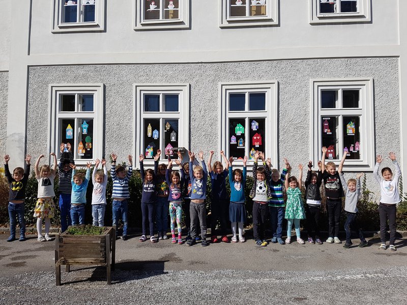 Die 1a Klasse vor den Fenstern ihrer Klasse