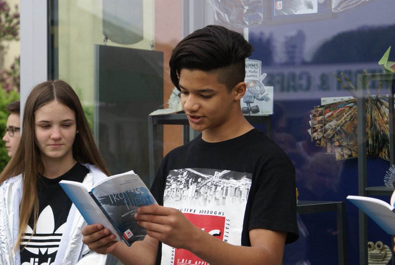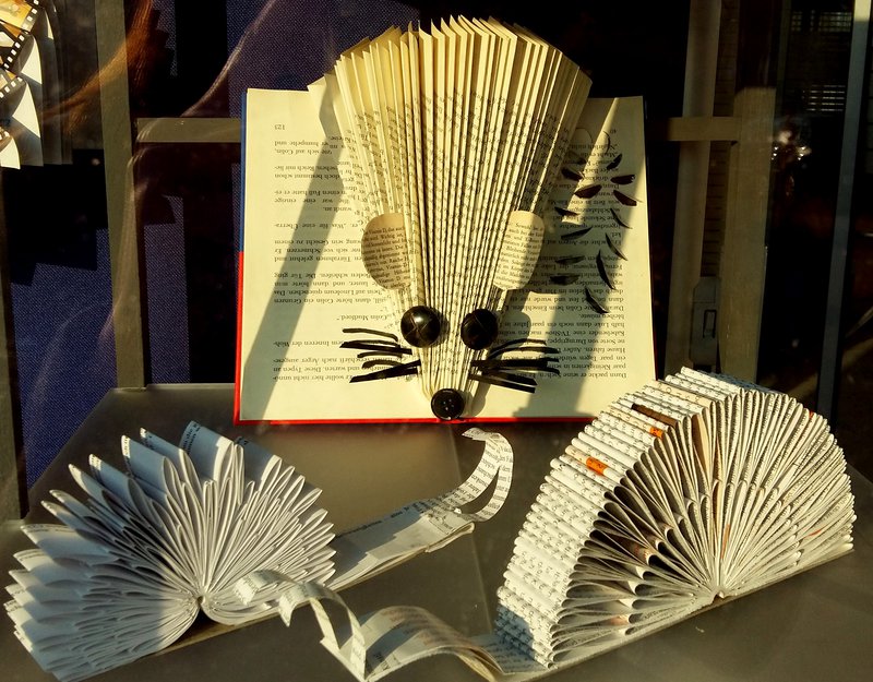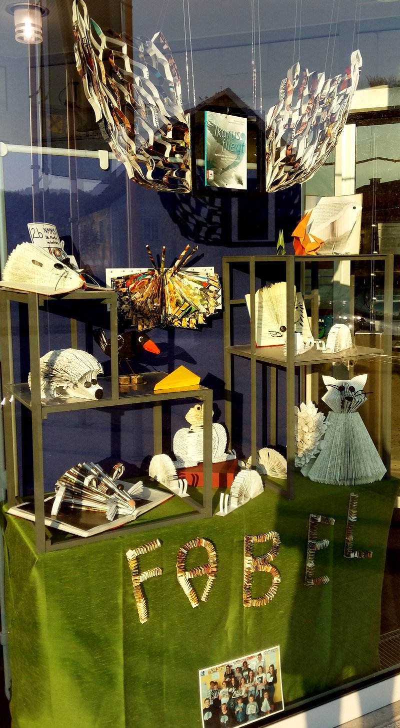 Da in unserer Jahresplanung (2. Klasse) die Fabel als Textsorte vorkommt, nutzten wir die Gelegenheit, dieses Thema mit dem Buch "Ikarus fliegt" zu verbinden. Kombiniert mit einem Arbeitsplan setzten sich die SuS intensiv mit dem Buch, insbesondere mit den Fabeln auseinander. In Form eines Projektunterrichts wurde die Idee umgesetzt, aus alten Büchern Fabeltiere zu gestalten. Durch Schneiden, Falten, Rollen, Reißen und Kleben entstanden viele unterschiedliche Tiere, die nun als Gesamtkunstwerk im Schaufenster der Raiffeisenbank St. Martin i. I. zu bestaunen sind. Sehr motiviert und fleißig beteiligten sich die SuS am gesamten Projekt. Es war für alle eine gute Möglichkeit, Fabeln neu, lebendig und fächerübergreifend zu erleben. Voller Stolz präsentierte die Klasse bei der Eröffnung ihre Werke. Untermalt wurde diese gekonnt mit vorgetragenen "Fabelgedichten" und dem Vorlesen einer Fabel aus "Ikarus fliegt". Unser Leseschaufenster ist bereits jetzt ein voller Erfolg für alle Beteiligten.