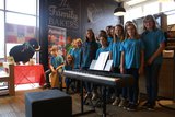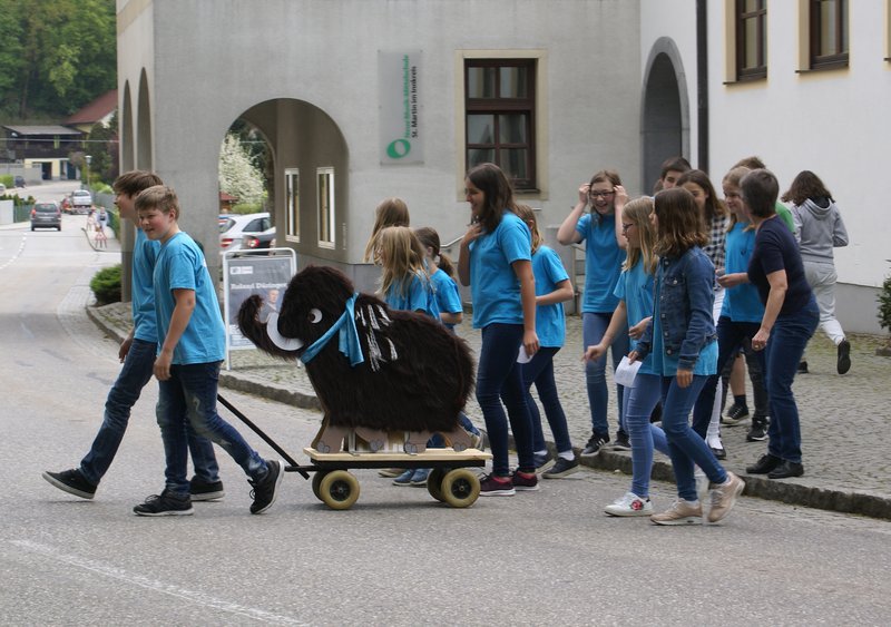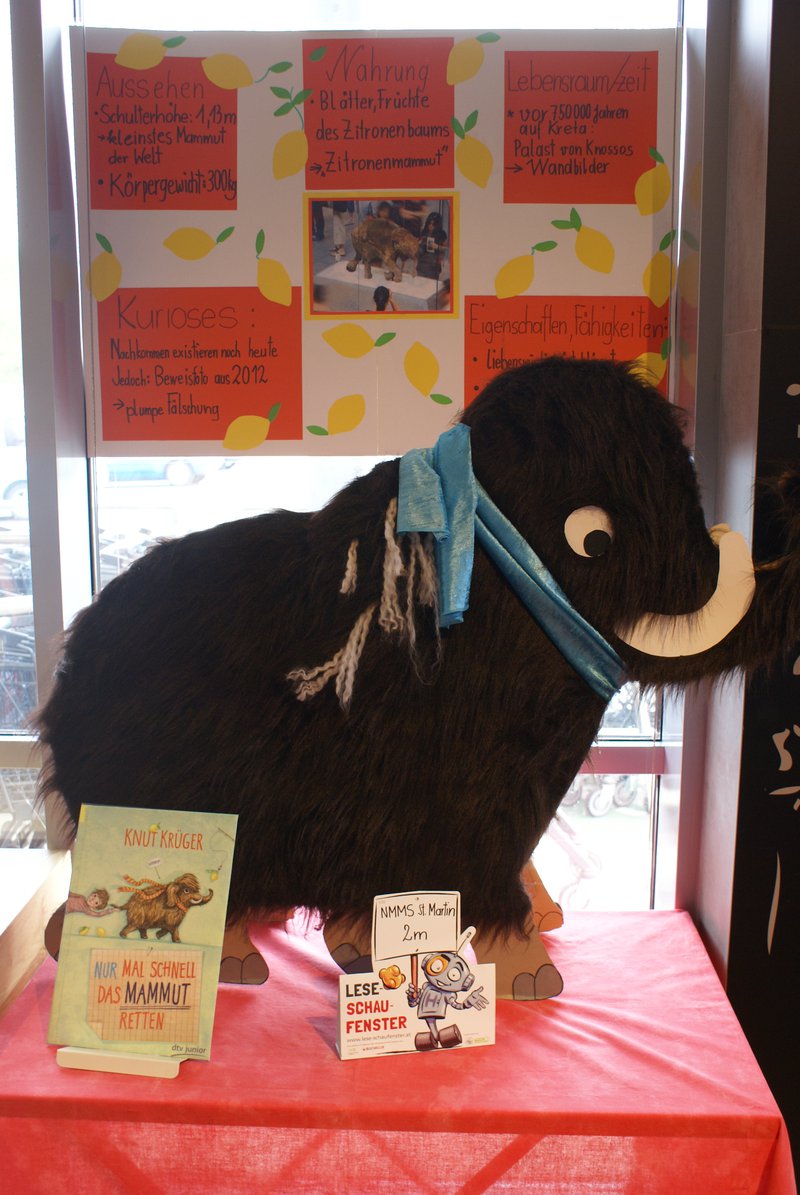 Die witzige Geschichte von Norbert, dem Zwergmammut, lasen die Kinder gemeinsam in knapp 3 Unterrichtseinheiten. Jeder Schüler, jede Schülerin der Klasse durfte 2-3 Seiten aus dem Buch vortragen, die Lehrerinnen erzählten dazwischen immer wieder ein Stückchen weiter. Danach ging’s ans Basteln. Es war für die Kids sehr spannend, wie das Mammut Schritt für Schritt Gestalt annahm. Das MindMap für das Plakat über „Mammuthus kreticus“ entstand auch gleichzeitig. In einem wahren Triumphzug wurde dann der „gerettete Norbert“ zu unserem Ausstellungsort, Spar Bachmayr, auf einem selbst gebastelten Wägelchen gezogen. Die Eröffnung wurde von den Kindern selber mit einem schwungvollen “Lesesong” umrahmt. Es war ein großer Spaß und wird den Kindern sicher lang in Erinnerung bleiben.