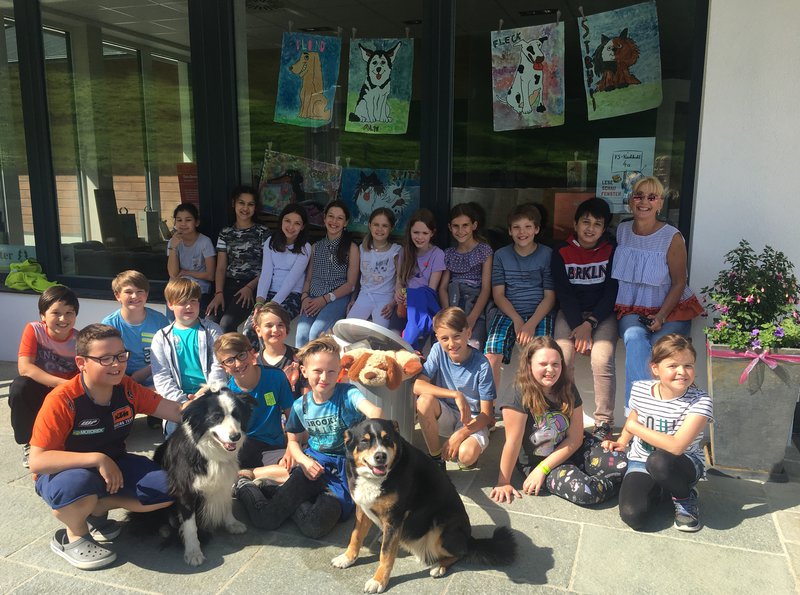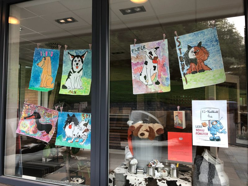 Das Buch wurde von der Klassenlehrerin vorgestellt und vorgelesen. Danach wurden alle 6 Streuner/ Hunde gezeichnet und bemalt. Das Auswählen des Schaufensters fiel uns nicht schwer, da der Vater eines Schülers ein Geschäft bzw. eine Firma in Kirchbichl besitzt. Somit war ein passender Standort gleich gefunden. Die Familie Oberleitner stellte uns gerne eines ihrer Schaufenster zur Verfügung und half beim Dekorieren fleißig mit. Als Dekoration verwendeten wir auch eine Mülltonne, wie sie auch auf dem Umschlag des Buches zu sehen ist. Müll ( alte Dosen, Schuhe, Fetzen, Papier....) durfte natürlich auch nicht fehlen. Um DAS perfekte Foto zu machen, brauchten wir auch echte Tiere. Kein Problem für uns: Familie Oberleitner "lieh" uns auch ihre Hunde! Das Fotografieren war zwar nun nicht einfach, machte dafür aber großen Spaß! Es war ein gelungenes Leseprojekt und alle arbeiteten fleißig und mit großem Eifer mit!!!