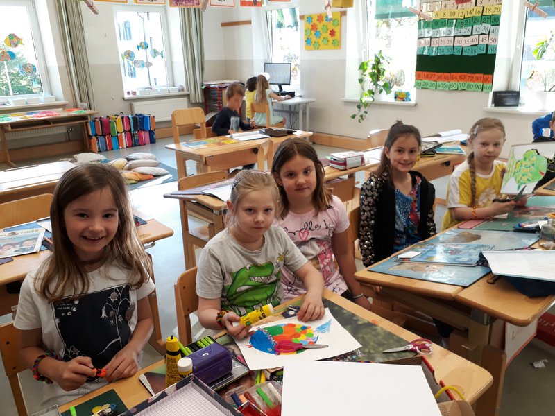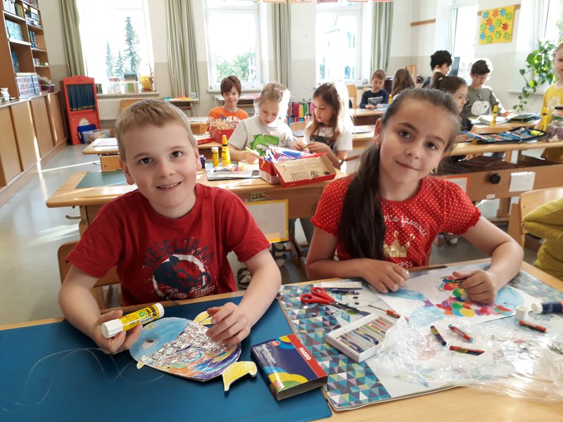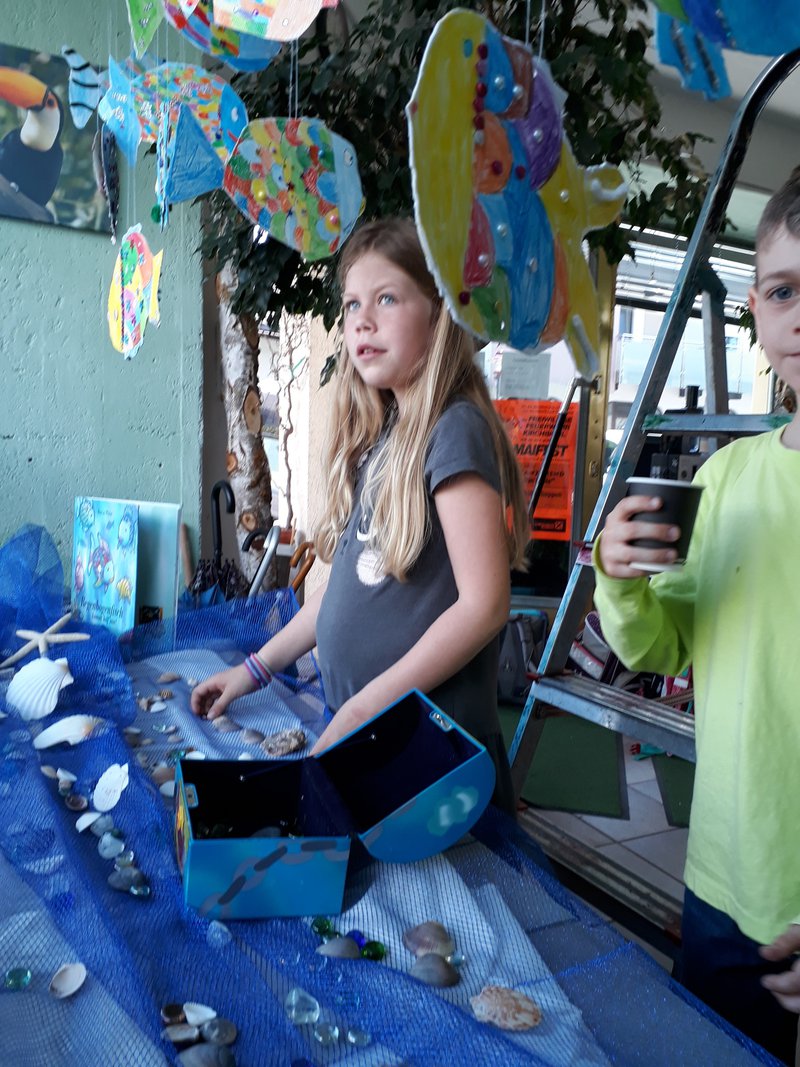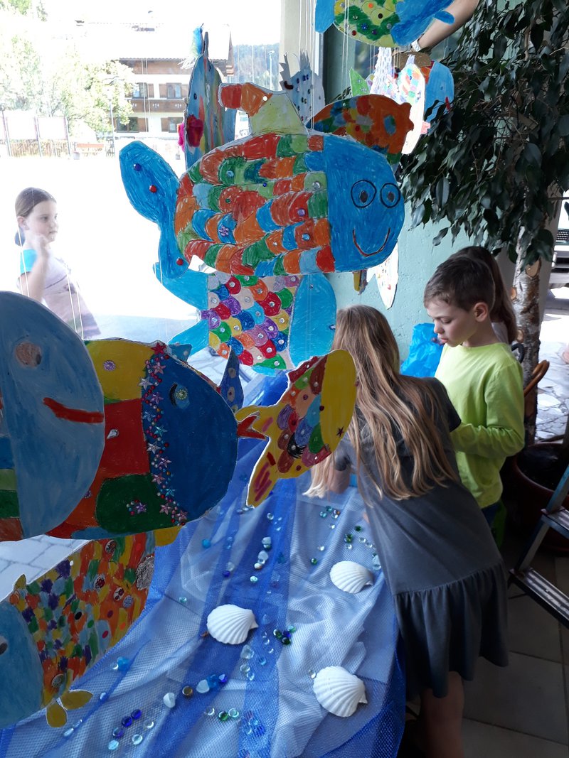 In der Klasse haben wir die Geschichte des Regenbogenfisches gelesen, Fische gebastelt und diese im Schaufenster mit Meereshintergrund und Muscheln ausgestellt.