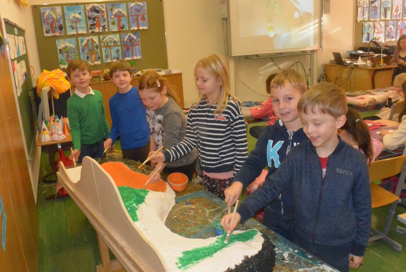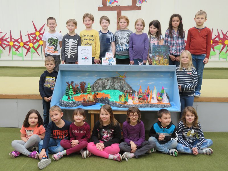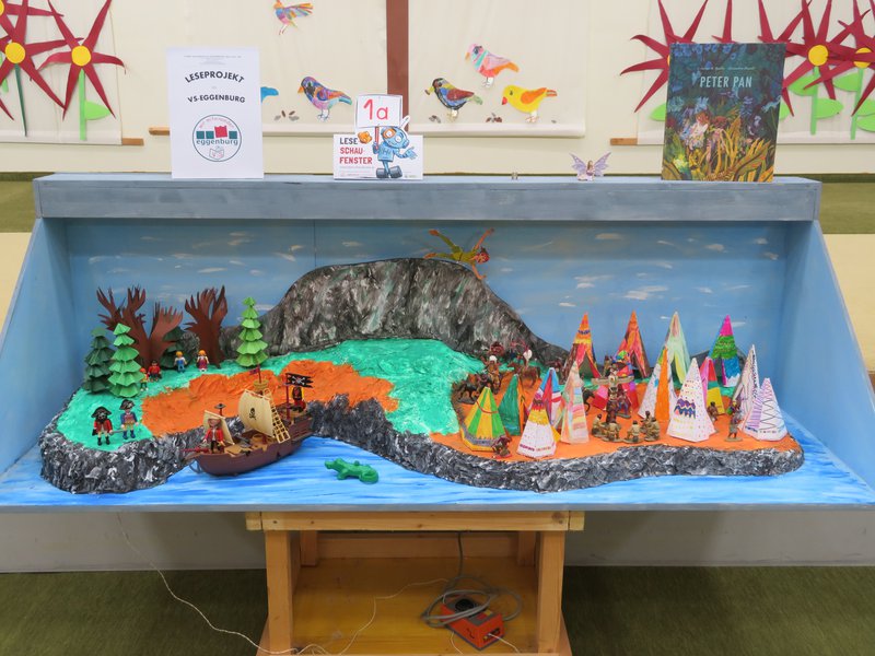 Im Rahmen des Deutschunterrichts wurde das Buch von der Lehrerin Karin Wazlawik kapitelweise vorgelesen. Die Kinder hörten immer gespannt zu. Danach beschlossen wir, unser eigenes Nimmerland zu bauen. Unser Lehrer Günther Bauer machte einen Unterbau aus Gips, der dann im Rahmen des Zeichenunterrichts bemalt wurde. Die Kinder falteten Bäume und Indianerzelte und zum Schluss wurden dann noch passende Figuren aufgestellt. Wir waren sehr stolz auf unser Werk. Bei einem Lehrausgang bewunderten wir unser Nimmerland in der Auslage der Raiffeisenbank Eggenburg und auch die Auslagen der anderen Klassen unserer Volksschule. Die Geschichte von Peter Pan wird den Kindern noch lange im Gedächtnis bleiben. Einige Kinder waren sogar so motiviert, dass sie zu Hause noch eigene Projekte zu anderen Büchern gestaltet haben, die dann in der Klasse ausgestellt wurden.- Projektleitung: