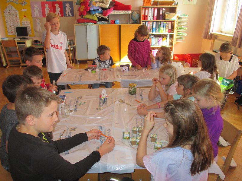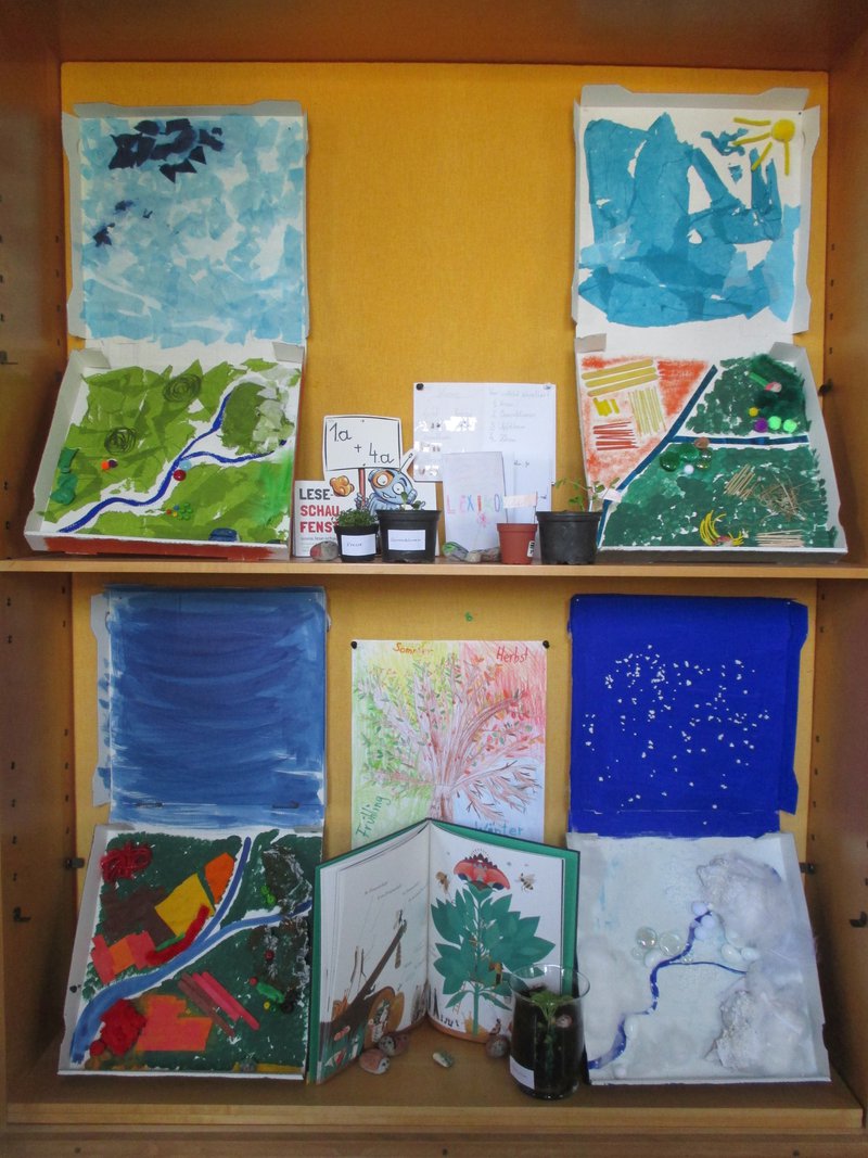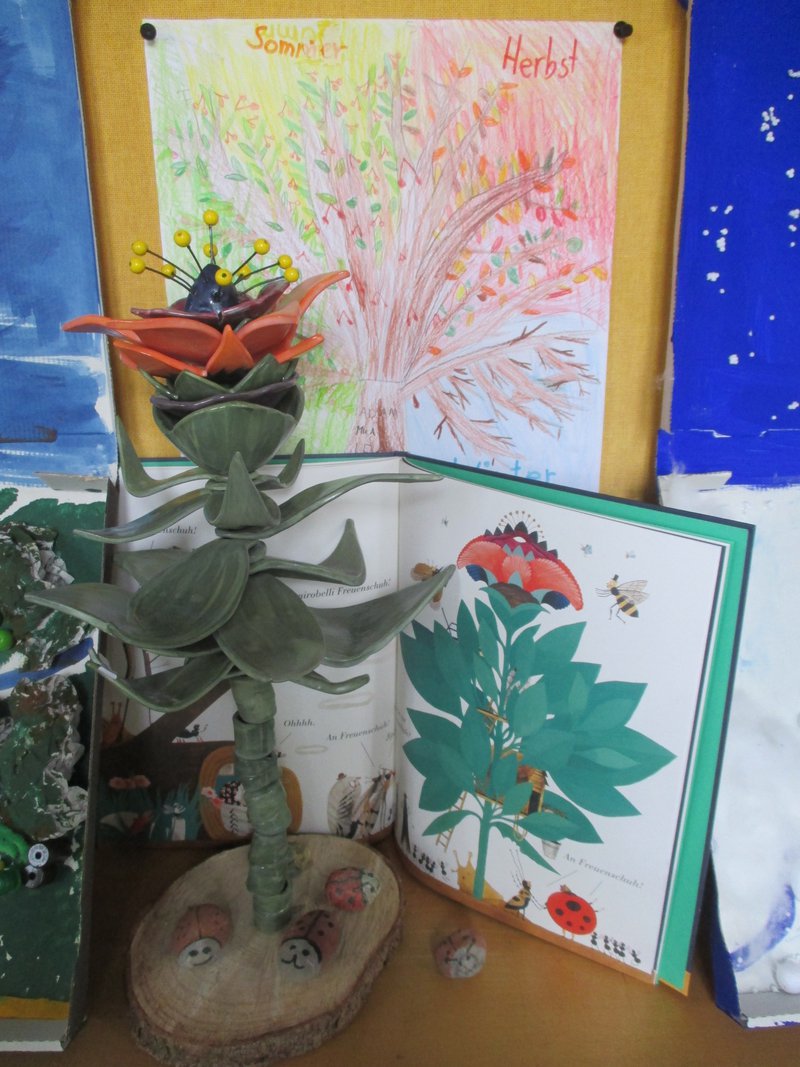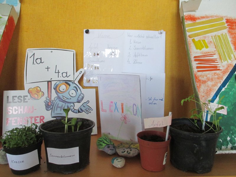 Das Buch "Wazn teez?" wurde den Kindern der 1a Klasse und der 4a Klasse gemeinsam von den beiden Lehrkräften vorgestellt. Jede Bilderbuchseite war Anlass, um Mutmaßungen und Thesen zu dieser genialen Fantasiesprache zu bilden und brachte wiederum neue Erkenntnisse darüber. Im gemeinsamen Brainstorming wurden folgende Ideen zur Gestaltung des Leseschaufensters festgelegt: Anfertigung von dreidimensionalen Modellen zu den vier Jahreszeiten, Zeichnungen zum Jahreskreis, eintopfen unterschiedlicher Samen (wer wächst schneller?), füllen von leeren Medikamentenkapseln mit Erde und Radieschensamen, diese werden auf alte Bleistifte aufgesetzt und eingepflanzt (am Glasrand sieht man das Austreiben der Wurzeln und der Pflanze), Einsatz von Leseförderern aus der Erwachsenenwelt (Elternverein...), Gestaltung eines Übersetzungslexikons, Übersetzung des Buches in Deutsch, Bosnisch und Serbokroatisch, Vorstellung des Buches im Kindergarten u.v.m.- Projektleitung: