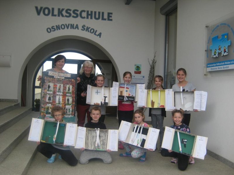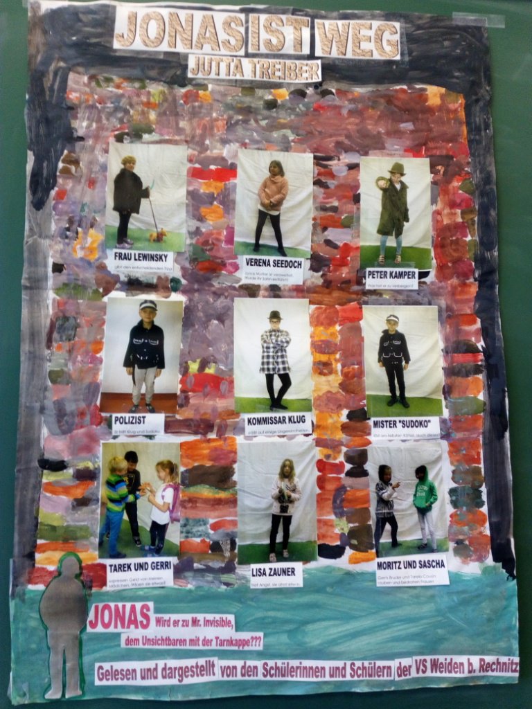 Obwohl das Buch auf der Auswahlliste für ältere Schüler steht, wagten wir uns beim ersten Lesenachmittag dieses Schuljahres an das Entdecken dieses Buches. Es hat die "Leseeulen" sofort in den Bann geschlagen und war so spannend, dass es noch am selben Tag ausgelesen werden musste. Noch sehr lange haben wir uns mit dem Buch beschäftigt. Wir stellten ein Tischtheater mit beweglichen Figuren in der Schuhschachtel her. Auf die aufgeklappten Deckel kamen unsere Reflexionen über die Figuren, das Buch, eigene Ideen und ein Brief an die Autorin. Als Abschluss spielten wir einzelne Szenen des Buches nach. Anschließend probierten wir verschiedene Posen und fotografierten sich gegenseitig. Die Bilder wurden auf einen gemalten Untergrund geklebt und mit Kurztexten in Form von "Kinoklapptexten" versehen. Die Hauptfigur "Jonas" wurde als grauer Schattenumriss dargestellt. Sowohl das Plakat als auch die Lesetheater-Boxen wurden im Schaufenster des Gasthauses Tallian Weiden b.R. ausgestellt.- Projektleitung: