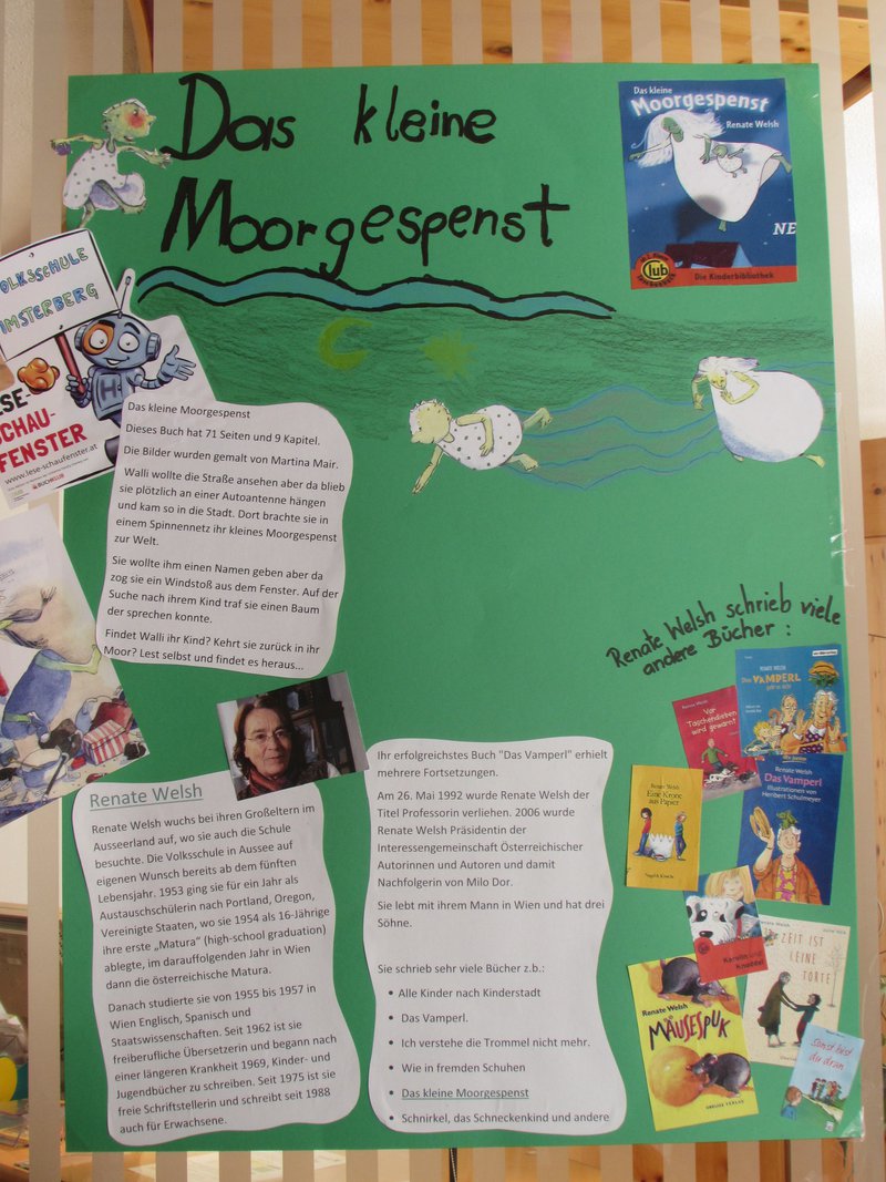 Die Schüler und Schülerinnen der Volksschule Imsterberg befassten sich intensiv mit Renate Welsh und dem Buch "Das kleine Moorgespenst". Gemeinsam wurde eine Lesedose gestaltet, ein Plakat zu Renate Welsh gemacht und Walli - das kleine Moorgespenst gebastelt. Alle Kinder lasen das Buch und gemeinsam wurde im Büchereikreis über die Erlebnisse von Walli gesprochen. Zusammen gestalteten die Kinder den Aufbau in der Raikafiliale in Imsterberg.