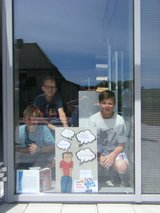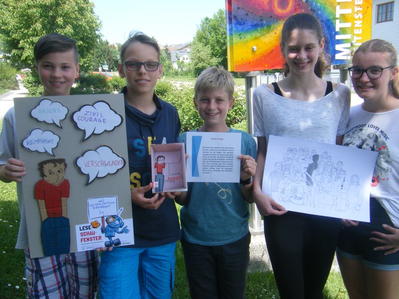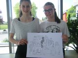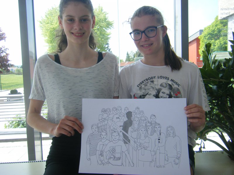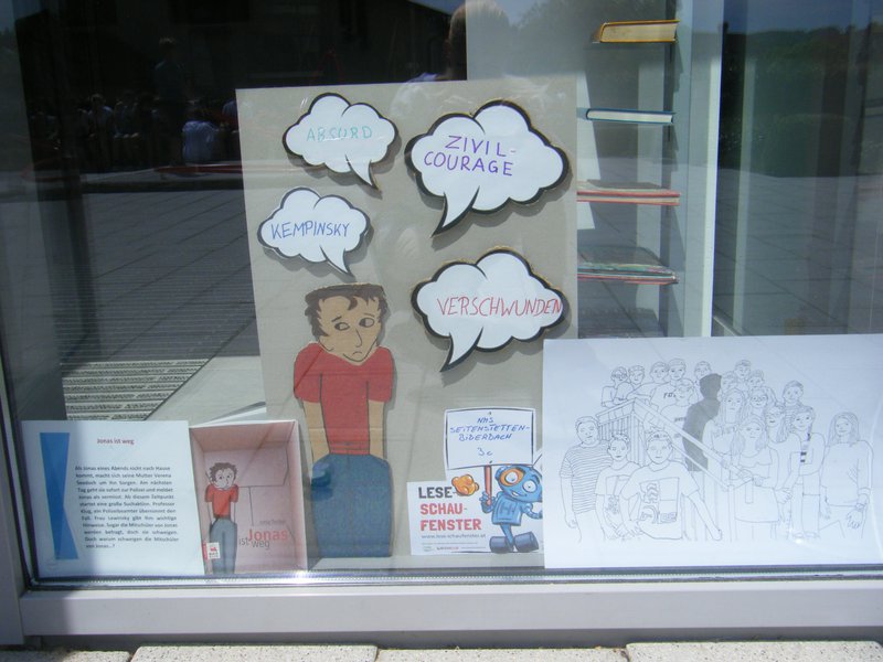 Einzelne Schüler haben sehr aufwendig die eigene Klasse gezeichnet, wobei ein Schüler auf dem Foto fehlt (--> Jonas). Sie haben zusätzlich noch den Jonas selbst gezeichnet und passende Schlagwörter dazugeschrieben. Auch ein kurzer Klappentext darf nicht fehlen, um mehr über das Buch zu erfahren und Lust zum Lesen zu bekommen.