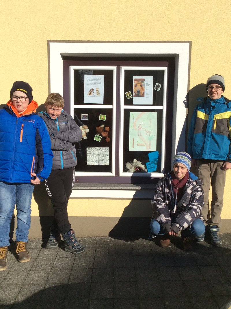 4 Buben der 3a gestalteten ein Fenster eines Gasthauses im Ort. Sie wollten die Aufmerksamkeit der Fußgänger auf das Buch mit Stofftier-Hunden lenken.- Projektleitung: