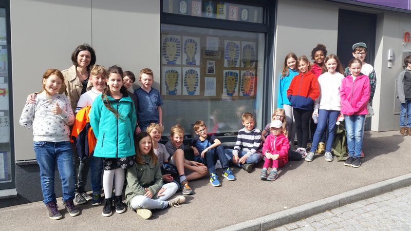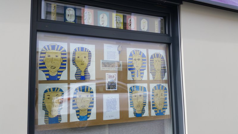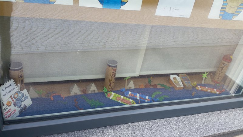 Das Buch wurde nach Anzahl der Kinder in Abschnitte geteilt und in der Klasse von den Kindern vorgelesen. Gleichzeitig haben wir uns mit unserer Klassenlehrerin Doris Ehemoser im Unterricht ausführlich mit dem Thema Ägypten beschäftigt und Informationen gesammelt. Im Zeichnen und Werken entstanden dann die Ausstellungsstücke für unser Leseschaufenster.