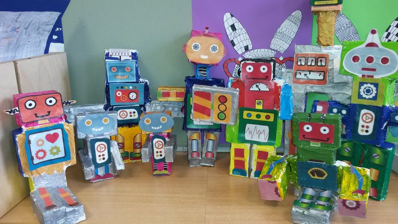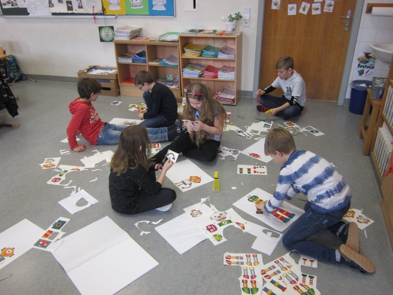 Die Kinder gestalteten Zeichnungen zu den einzelnen Kapiteln des Buches und stellten und lasen somit die Geschichte den Mitschülern vor. Im Zeichen- und Werkunterricht wurden dann mit der Klassenlehrerin Petra Kopp aus verschiedensten Materialien Roboter gebaut.- Projektleitung: