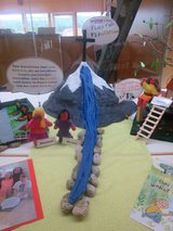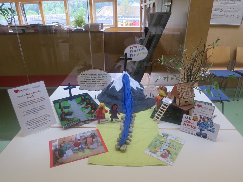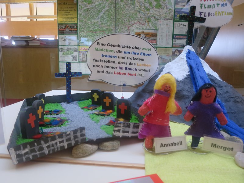 Die Inhalte des Buches für das Leseschaufenster der 4. Klasse der VS St. Nikolai i.S. wurden im Deutschunterricht mit Sieghilt Haring erarbeitet. Anschließend wurde die kreative Umsetzung im Werkunterricht von Elisabeth Hölbing gemeinsam mit den Kindern geplant und realisiert. In Gruppenarbeit wurde fast 2 Monate an der Umsetzung der zusammengefügten Teile gearbeitet: Aus Gipsbinden wurde ein Drahtgestell als Berg mit Wasserfall modelliert; Figuren, Wurzeln und Baumstamm wurden mithilfe der Kleistertechnik modelliert und die Baumkrone aus Zweigen hergestellt; Das Baumhaus darunter steht auf einem zusammengenagelten Holzplateau mit zusammengeleimter Holzleiter und entstand aus einer mit Holzteilen beklebten Kartonschachtel; Kleidung wurde aus Filz genäht, der Friedhof ist eine mit gesägten Holzgrabsteinen gestaltete Kartonschachtel. Die Werkstücke wurden zusammen mit auf Sprechblasen geschriebenen sprachlichen Inhalten und Zitaten aus dem Buch als Leseschaufenster ausgestellt.- Projektleitung: