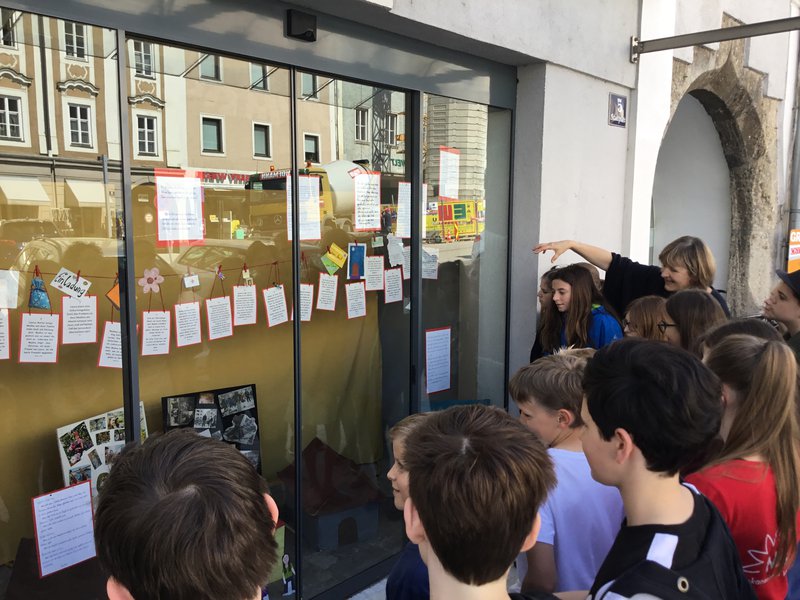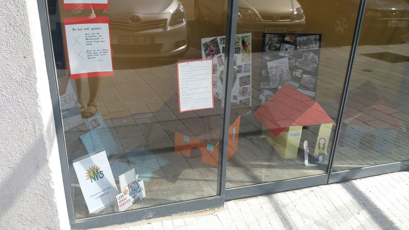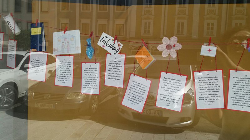 Die Lektüre dieses Romans in Tagebuchform war für eine dritte Klasse NMS durchaus anspruchsvoll und herausfordernd, gleichzeitig wurde dadurch eine tief gehende Identifikation mit der Protagonistin erreicht. Die Kinder erfuhren nicht nur viel Neues, sie konnten auch – wenigstens ansatzweise- nachempfinden, wie es sich anfühlt, in einer neuen Kultur ganz von vorne zu beginnen. Um den „roten Faden“ durch das Buch sichtbar zu machen, brachten die Schüler und Schülerinnen den Inhalt überblicksmäßig zu Papier und suchten bzw. bastelten Symbole zu den einzelnen Kapiteln. Darunter ließen sie die Lebenswelten der Hauptfigur und deren Freundin entstehen: In der Mitte die Schule als gemeinsamer Lebensraum, dahinter und daneben die „Herkunftswelten“ der beiden Mädchen. Abgerundet wird das Schaufenster durch persönliche, handschriftliche Buchkritiken.