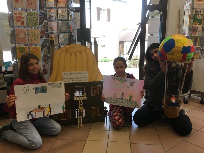 Die Schüler haben das Gefängnis, genannt "Der Guglhupf" und den Ballon, mit dem ein Befreiungsversuch durchgeführt wurde, gebastelt. Außerdem sind einige Zeichnungen (die Hauptpersonen - Besuch der Mutter im Gefängnis - der misslungene Befreiungsversuch mit dem Elektromobil) sowie einige wichtige Textstellen aus dem Buch dargestellt.- Projektleitung: