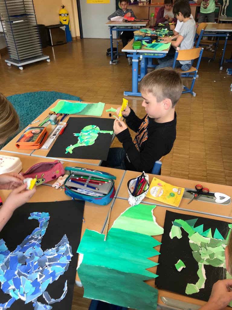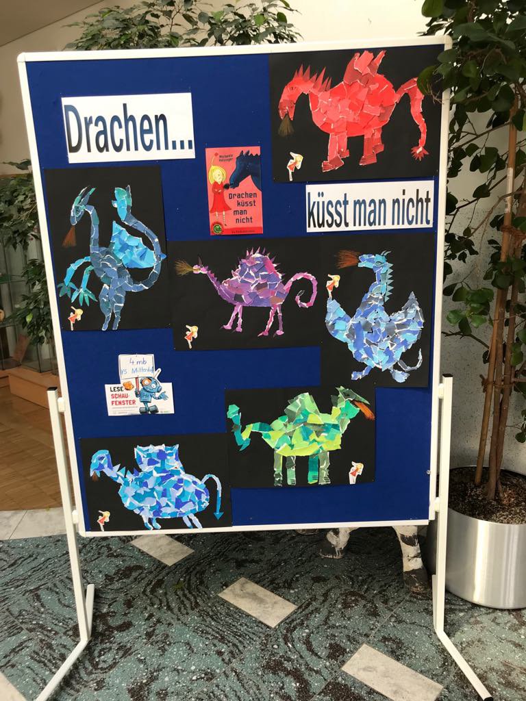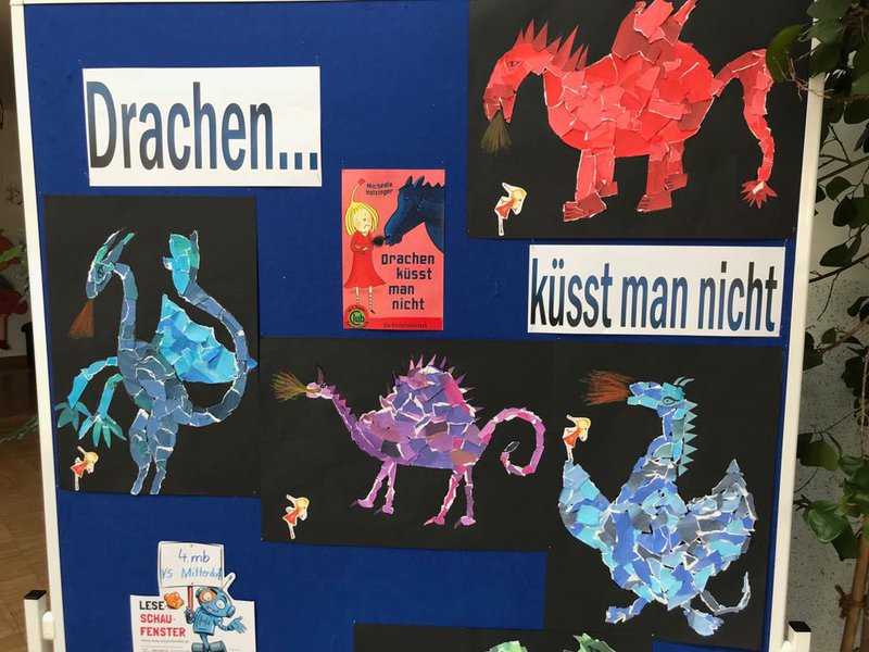 Anlass zur Gestaltung dieses Leseschaufensters gab uns ein Schüler, der das Buch "Drachen küsst man nicht" von Michaela Holzinger in seiner Buchvorstellung präsentierte. Die Begeisterung und Neugierde der Kinder war so groß, dass wir kurzerhand beschlossen, das Buch als Klassenlektüre zu lesen. Die Inhalte wurden dann in einem Leseplan gefestigt. Den kreativen Abschluss bildete dann die Erstellung eines "Reißbildes", welches den Drachen Jaromir, der gemeinsam mit der Prinzessin Kunigunde die Hauptfigur des Buches ist, darstellen sollte. Die Kinder hatten an dieser Technik große Freude und waren beeindruckt von ihren Ergebnissen. Die Präsentation in der Aula der Volksschule fand nicht nur bei der restlichen Schülerschaft, sondern auch bei den Eltern, die die Kunstwerke beim Elternsprechtag begutachten konnten, positiven Anklang.- Projektleitung: