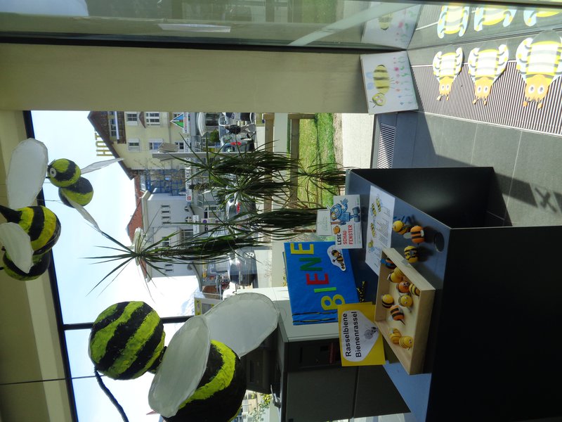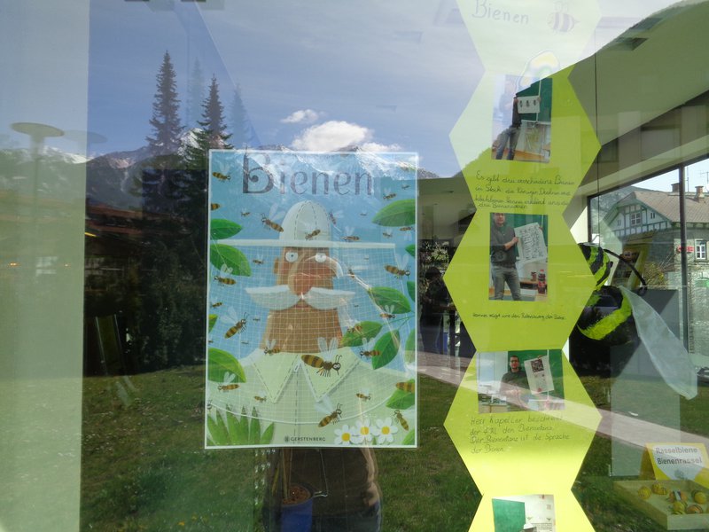 Unsere Schulbibliothekarin kannte das Buch bereits von der Bibliothekarsausbildung. Es hat ihr persönlich mit den vielen ansprechenden Bildern sehr gut gefallen. Auch die Kinder waren begeistert und wollten die verschiedensten Zeichnungen des Buches nachmalen. Im Zuge des Projektes entstanden die Rasselbienen in Zusammenarbeit mit Kindern unserer Nachbarsschule (ASO Ötztal Bahnhof), Pappmachèbienen, ein Bienenbuch und die Wabendoku mit Fotos und Text. Zusätzlich wurde das Biene Maja Lied gesungen und kleine Projekte und Stationenbetriebe gemacht. Zudem war noch ein Imker auf Besuch. Dieses Buch ist zwar ein Sachbuch, hat aber einen ganz anderen Zugang. Im Vordergrund stehen die vielen teils lustigen Bilder, die die Schüler/innen dann in weiterer Folge zum Lesen animieren. Wir haben dieses Buch deshalb als Grundlage für das klassenübergreifende Gestalten des Schaufensters und damit zusammenhängend als Basis für kleinere Bienenprojekte in den einzelnen Klassen gewählt.