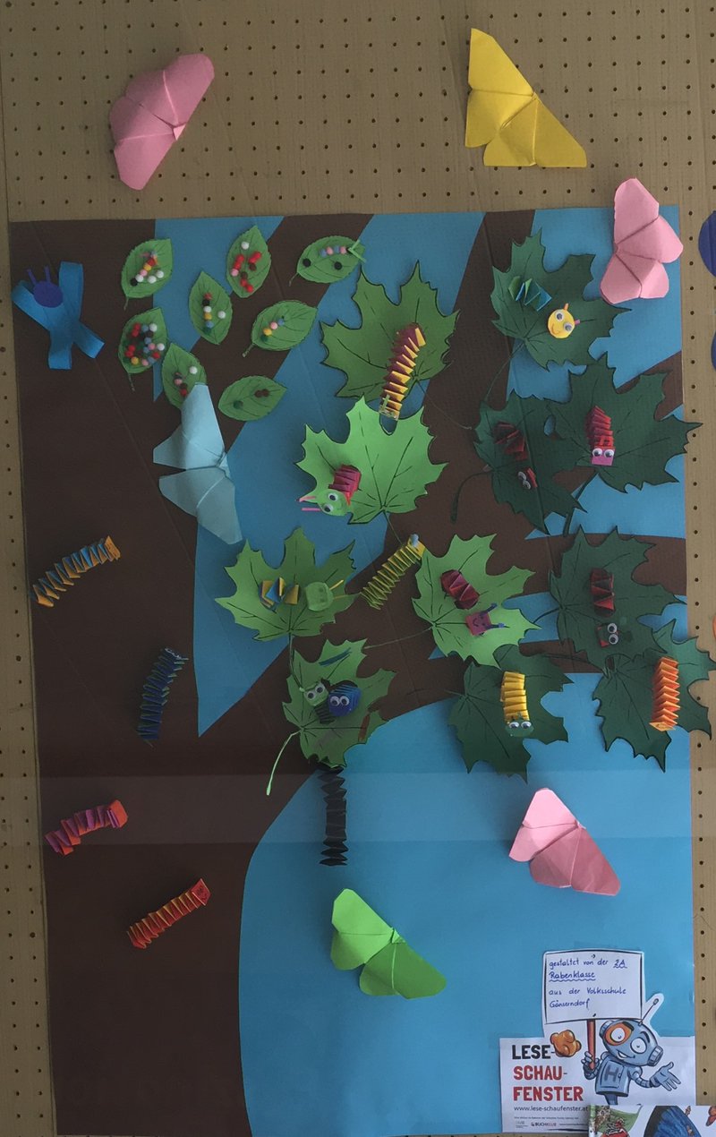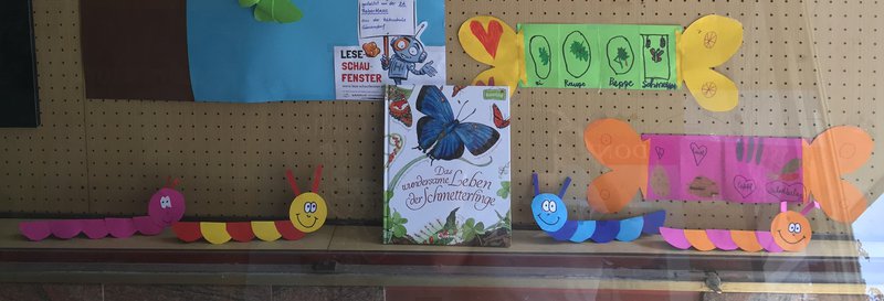 Die 2A Rabenklasse hat sich dieses Jahr ausführlich mit dem Thema Schmetterlinge beschäftigt. Wir haben Distelfalter selbst gezüchtet und konnten dabei sogar beobachten wie ein Schmetterling aus der Puppe schlüpft. Während unserer Beobachtungsphase haben wir auch das Buch "Das wundersame Leben der Schmetterlinge" vorgelesen und uns die wunderschönen Zeichnungen darin angesehen. Die Kinder waren begeistert. Zum Abschluss unserers Projekts gestalteten wir dieses Lese-Schaufenster.- Projektleitung: