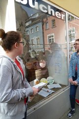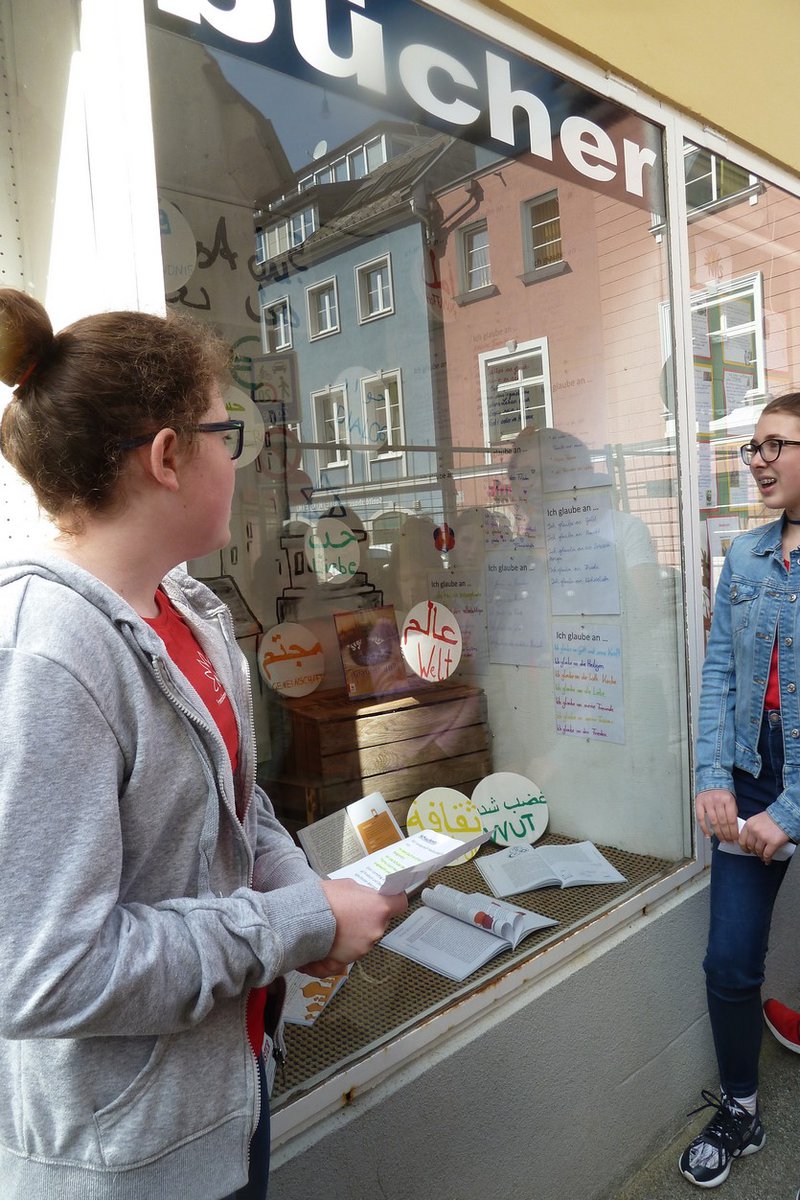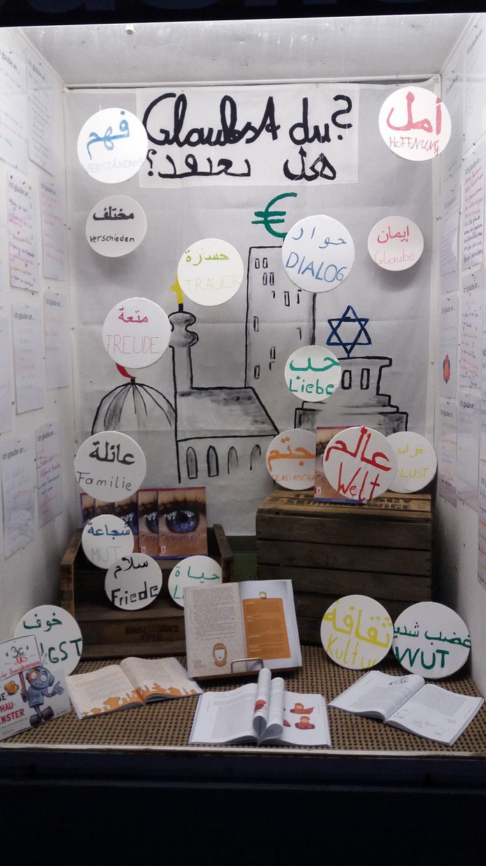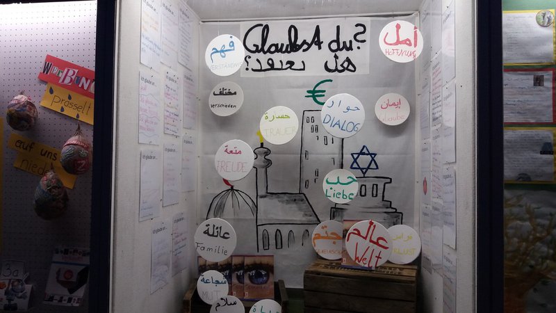 Im Rahmen eines Klassenprojekts über den Islam haben wir uns mit dem Buch „Glaubst du?“, insbesondere mit den abwechslungsreichen Erzählungen über den Islam, beschäftigt. Verschiedene „Schlagwörter“ in Arabisch und Deutsch prägen das Schaufenster. Diese wurden auf Stoff gemalt, anschließend wurden damit Blumenuntersetzer bezogen. Den Schaufenster-Hintergrund bilden die drei Gotteshäuser der drei führenden Weltreligionen. Diese werden vom höchsten Gebäude – dem Turm des Glaubens ans Geld - überragt. Weiters hat jede Schülerin und jeder Schüler ihre/seine persönlichen Glaubenssätze aufgeschrieben. Bei einer Vernissage präsentierte die 3c den anderen Klassen ihr Schaufenster.