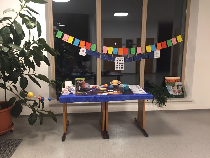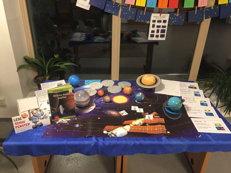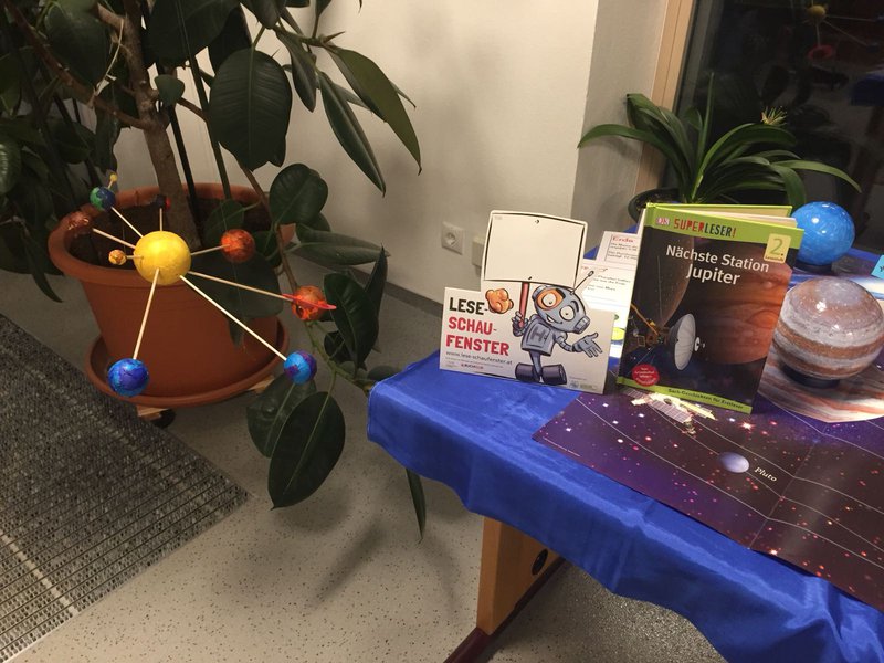 Angeregt durch das Buch "Superleser! Nächste Station Jupiter" entstand ein schulstufen- und fächerübergreifendes Projekt, das sich über den ganzen Weltraum erstreckte. Hilfreich und unterstützend waren dazu auch die Themenhefte "Auf ins Weltall!". Als Abschluss des Projektes gestalteten wir im Foyerbereich unseres Gemeindeamtes das Leseschaufenster.