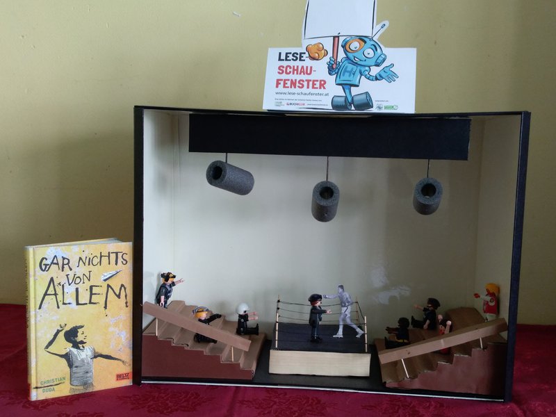 Es handelt sich um ein Gemeinschaftsprojekt zweier Schüler der 3 d (7. Schulstufe). Die Arbeit zeigt eine Szene aus dem Roman "Gar nichts von allem".