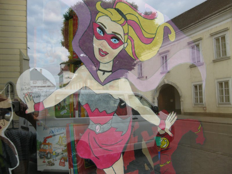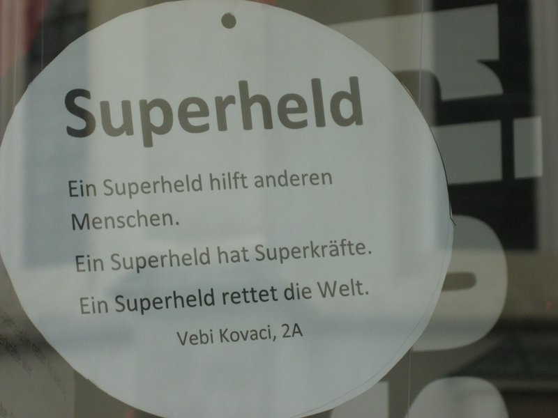 Thema: "Superhelden - von Odysseus bis Lara Croft"/ Deutsch Literaturvermittlung (Antike Sagen bis Comics und Grafic novels) und Bildnerische Erziehung.(großformatige Zeichnungen von Superhelden/innen mit widersprüchlichen Buchtiteln, z. B. Superman - mutig, hält ein Buch über Angstbewältgung in Händen) Fragestellung: Was ist ein Superheld? Recherche zum Thema: Superhelden/Superheldinnen - einst und jetzt; Steckbriefe verfassen; Lesen von Sagen, Textstellen aus den im Crossover voreschlagenen Büchern, z. B. Tribute von Panem, Percy Jackson; Gespräch und Beispiele über Vermarktung (z. B. Star Wars usw. ) Abschließend Gestaltung- Projektleitung: