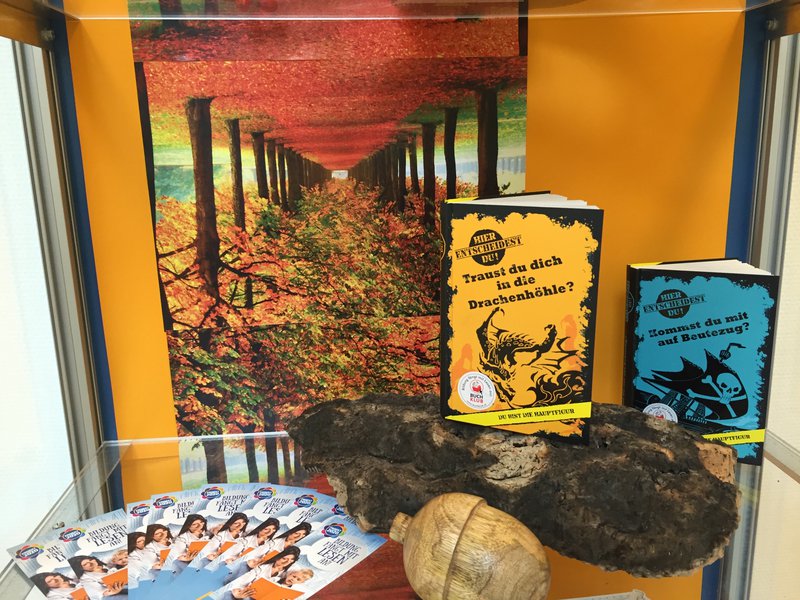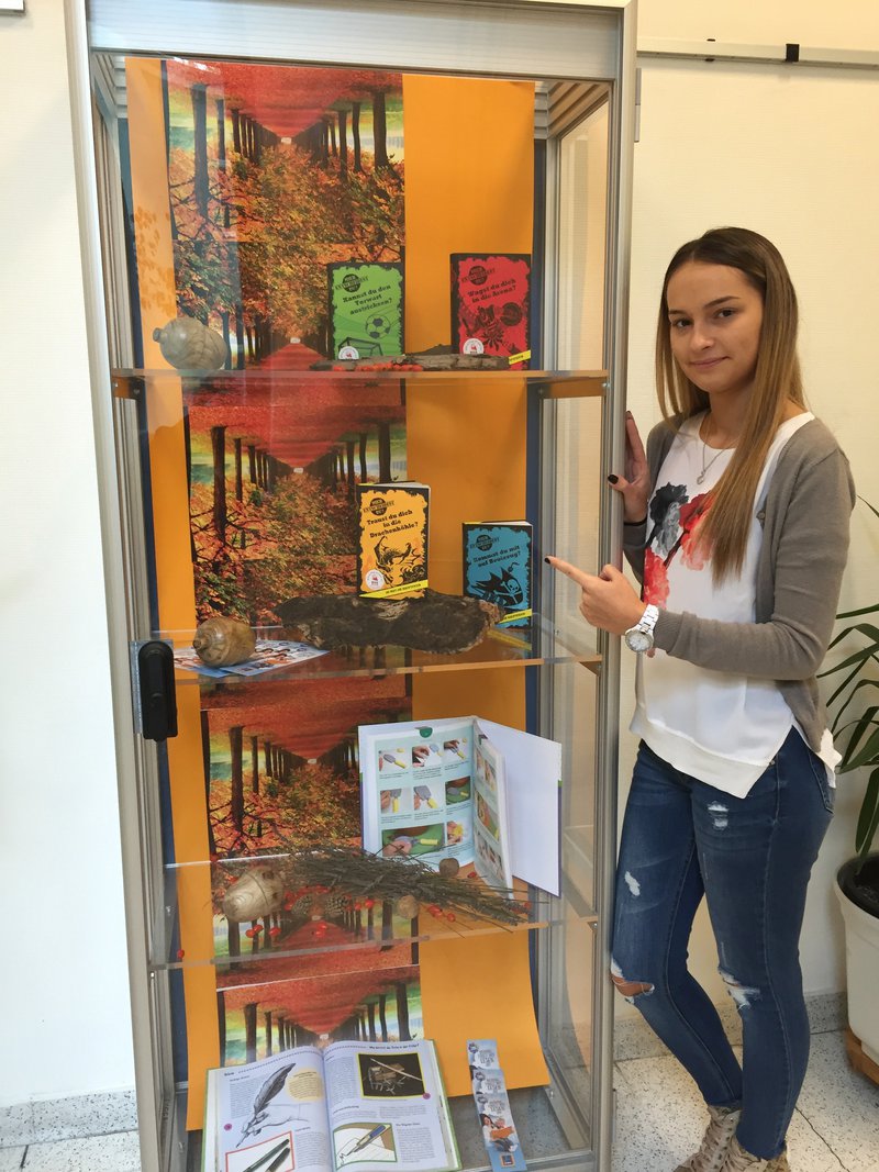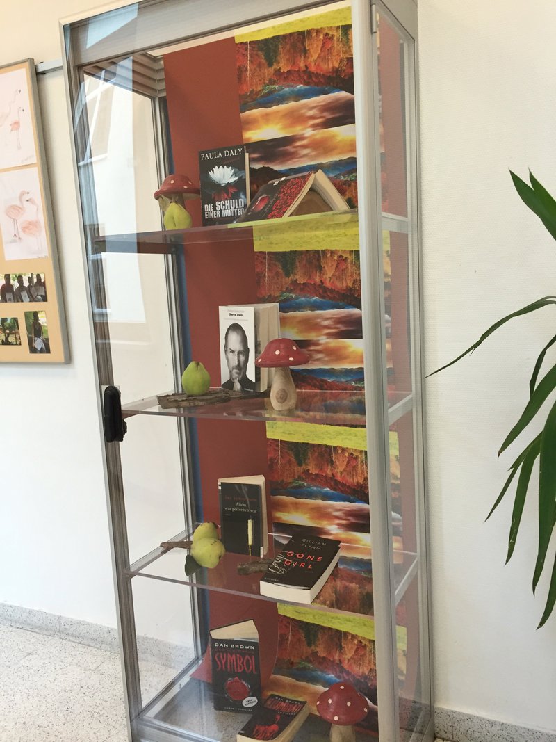 SchülerInnen präsentieren ihre Bücher passend zur Jahreszeit mit herbstlichem Hintergrund und stimmen die Farben mit dem Buchcover ab. Unter dem Motto "Less is more" werden die einzelnen Exemplare in Position gebracht und im Goldenen Schnitt präsentiert. Rückwandgestaltung und Blickfang geben der Vitrinengestaltung einen stimmigen Rahmen.- Projektleitung:
