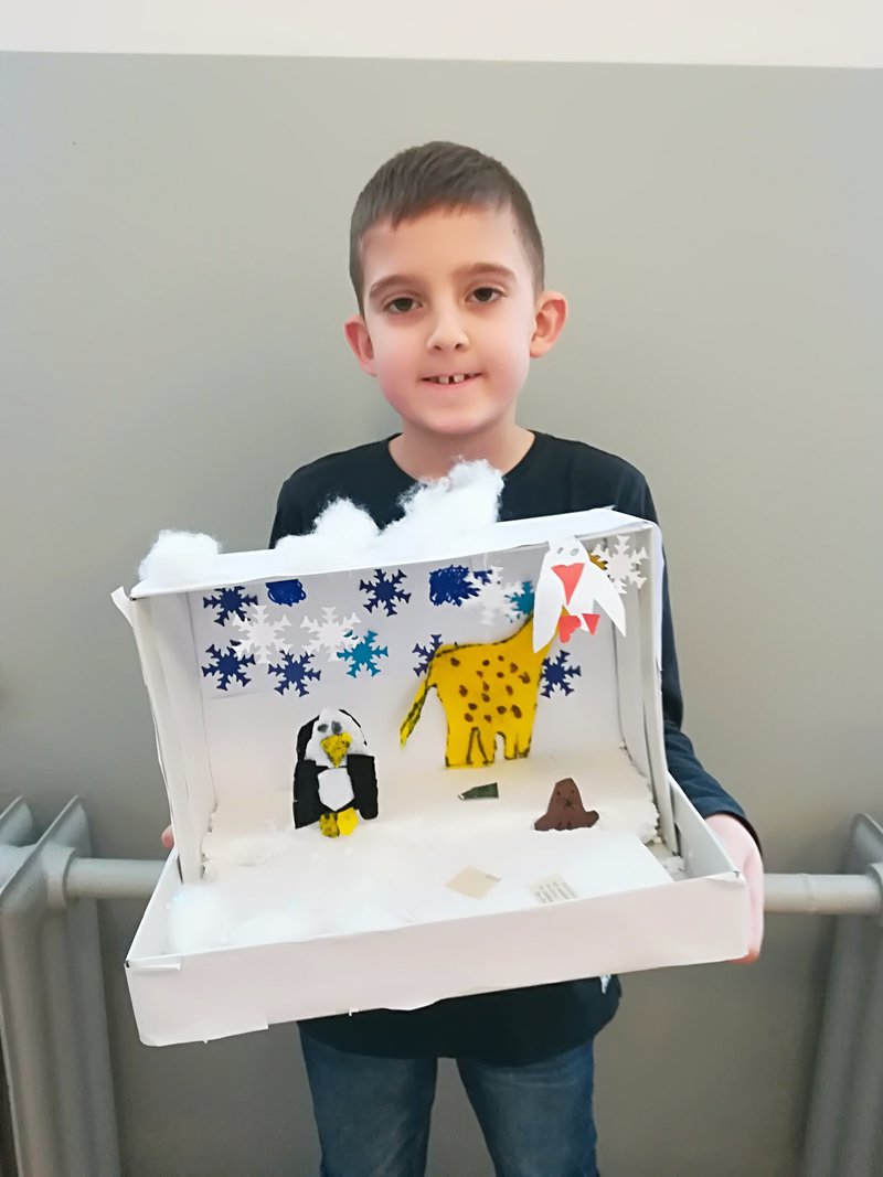Nachdem das Buch gemeinsam gelesen bzw. vorgelesen worden war, ging es an die Arbeit: Die Kinder schrieben Briefe an Pinguin oder Giraffe. Es gab einen Lieblingsbuchtag, ein andermal galt es, die Geschichte von Pinguin und Giraffe weiterzuerzählen. Auch Sachtexte über die zwei unterschiedlichen Tiere wurden gelesen und deren Lebensräume erkundet. Dies alles wurde in einer Projektzeitung festgehalten. Am meisten Spaß hat den Kindern das Basteln der Leseschachteln bereitet!- Projektleitung: