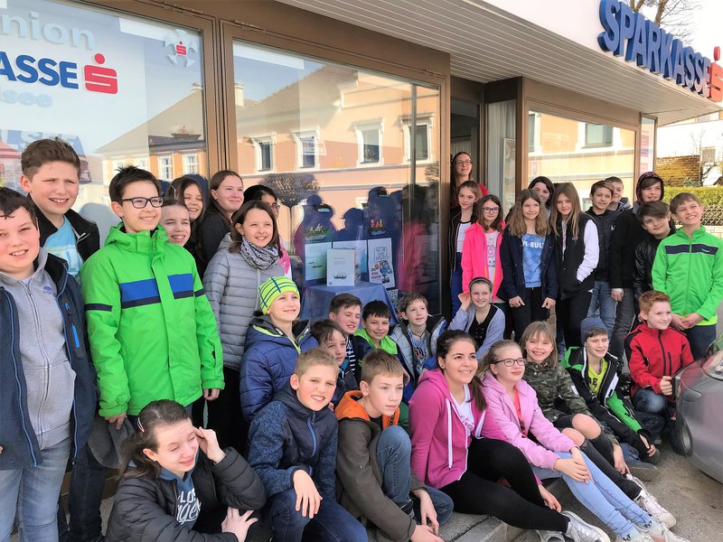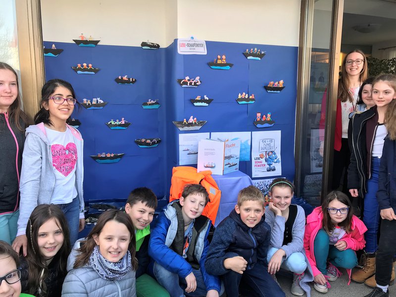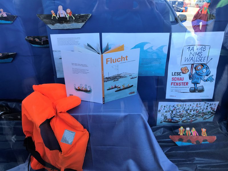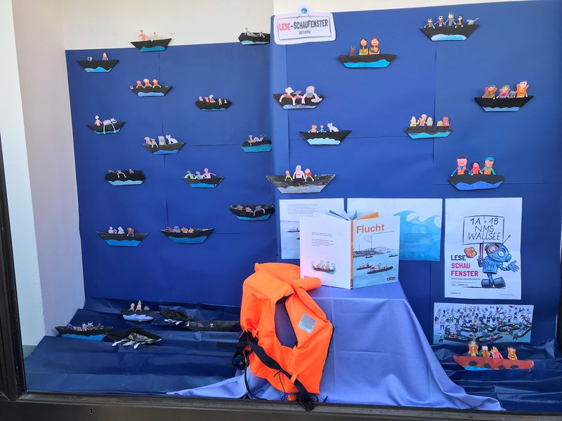 Die Schülerinnen und Schüler der 1A und 1B der Neuen Mittelschule Wallsee gestalteten gemeinsam mit ihren Deutschlehrerinnen Frau Steinberger und Frau Rußmayr ein Schaufenster der Sparkasse Wallsee. Das Buch „Flucht“ von Niki Glattauer und Verena Hochleitner wurde den SchülerInnen zu Beginn vorgelesen. Fluchtgründe und Chancen für ein besseres Leben in einem fremden Land wurden erarbeitet. In der kreativen Arbeitsphase zeigten die Kinder die Flucht übers Meer.- Projektleitung: