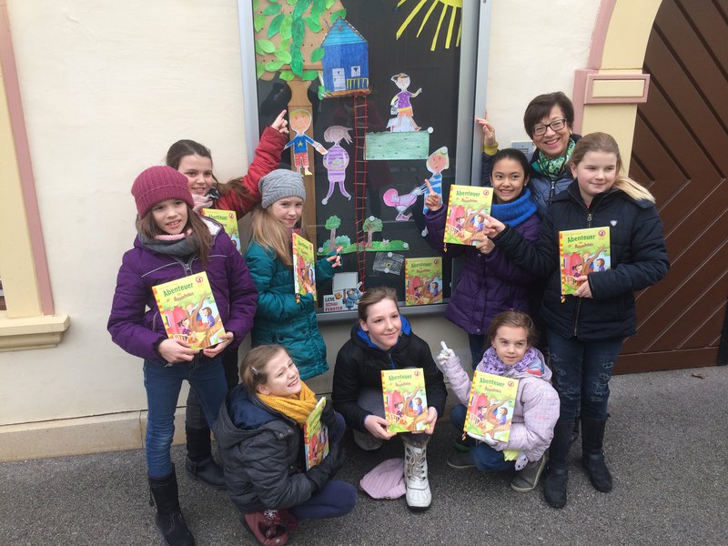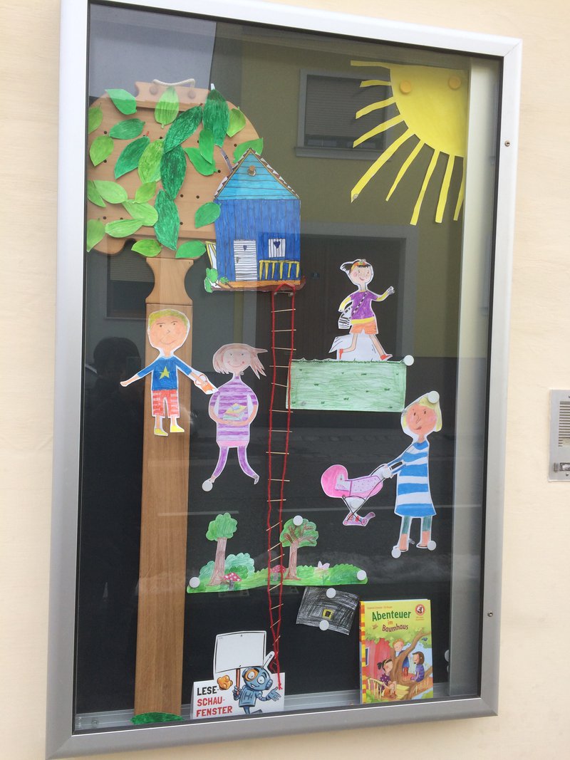 Das erste Kapitel des Buches "Abenteuer im Baumhaus" wurde gemeinsam gelesen. Dann lasen die Kinder in ihrem individuellen Tempo das Buch fertig. Bald hatte jeder eine Lieblingsfigur, die er malen wollte. Bei unseren Lehrmitteln fanden wir einen kleinen Baum. Ein netter Opa verlängerte den Stamm, passend für das Fenster. Eine besonders fleißige "Werkerin" häkelte eine Treppe zum Baumhaus. Die Figuren waren schnell fertiggemalt und schon konnten wir das Schaufenster im Rathaus schmücken.- Projektleitung:
