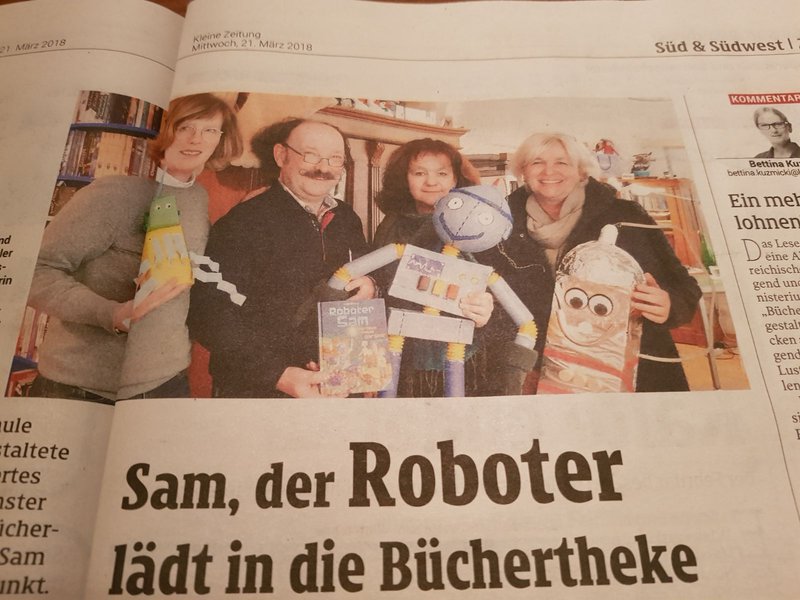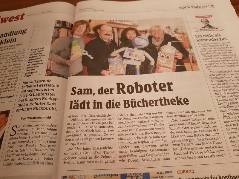 Mit viel Freude lasen wir die Taschenbücher vom Roboter Sam. Ein Roboter mit Gefühlen, der die Sprache der Menschen verstand, gefiel den Kindern. Mit viel Fantasie bauten sie die unterschiedlichsten Roboter aus Wegwerfmaterialien und hatten viel Spaß dabei.Natürlich mussten die tollen Werke ausgestellt werden und Herr Draxler stellte seine Auslage in seiner Büchertheke zur Verfügung. Auch in der Kleinen Zeitung erschien bereits ein Bericht über diese Aktion.