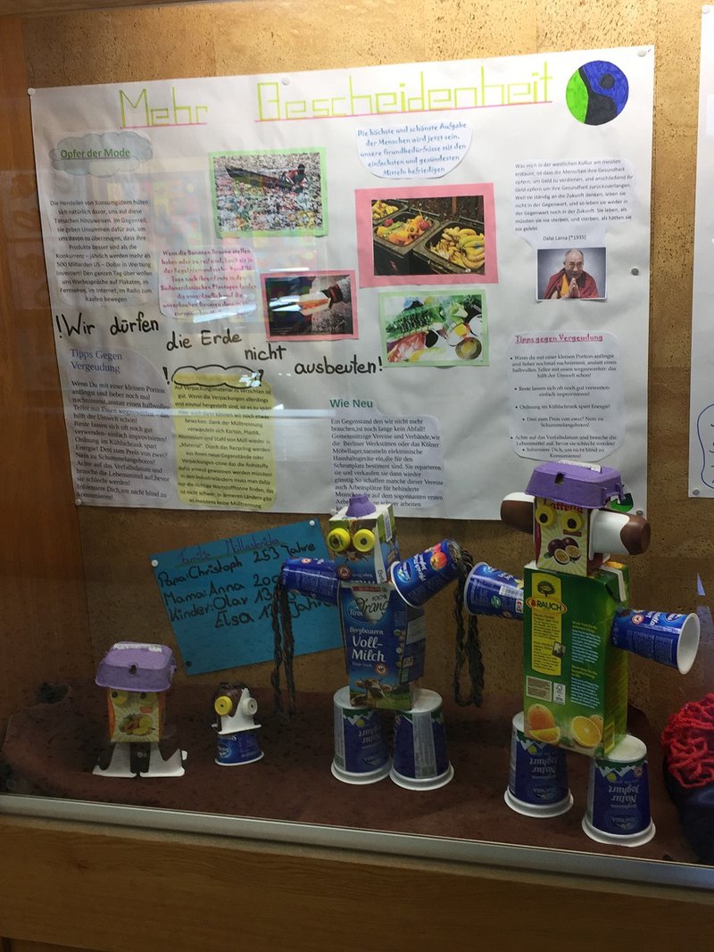 3 Teams der Klasse 3B beschäftigten sich mit 3 ausgewählten Kapiteln des Buches. Mehr Bescheidenheit, Mehr Frieden, Mehr Nähe zur Natur. Mehr Bescheidenheit: Die Plastikmüllfamilie symbolisiert die Jahrhunderte dauernde Verrottungszeit von Plastikmüll. Mehr Frieden: Die brennende Stadt steht für die Flüchtlingskrise und die Weigerung der Menschen zur Friedensentwicklung. Mehr Natur: Das Playmobilschiff steht für Öltankerunfälle und Überfischung im Ozean.